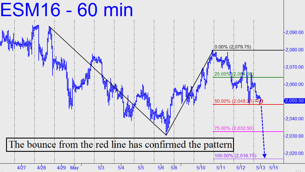 The bounce precisely from the red line has confirmed the pattern and its bearish target at 2016.75. If it’s achieved, the implied 35-point drop would be equivalent to about 300 Dow points. The futures have relapsed to the red line so quickly following yesterday afternoon’s rally that the line’s decisive breach seems likely. If it happens, subscribers could attempt to get short ‘mechanically’ at either p or d (but not x this time) on an upward retracement to either of those Hidden Pivots once they’ve been exceeded decisively for three consecutive bars. If you’re not sure how these trades work, stay tuned to the chat room, where there are many subscribers who qualify as experts on the tactic.