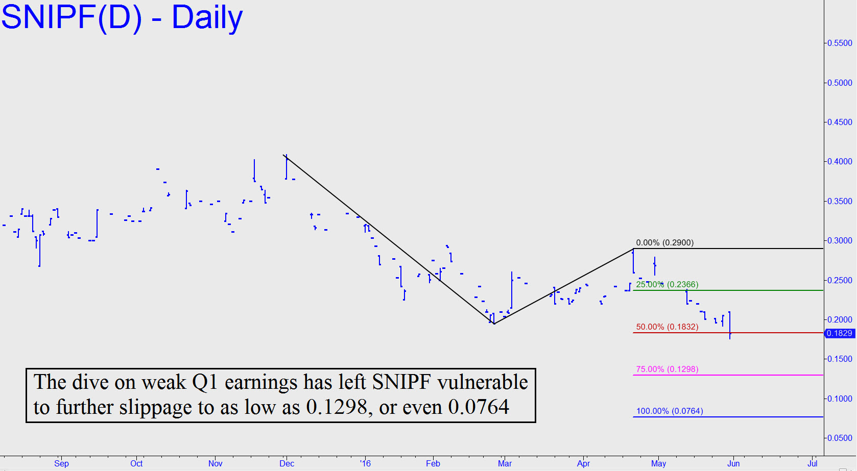 From a technical perspective, the stock’s slippage beneath a key ‘midpoint Hidden pivot’ at 0.1832 leaves it vulnerable to a fall to 0.1298 over the near term (i.e., within 3-4 weeks). Worst case if that ‘secondary’ pivot should fail would be 0.0764. As noted above, I will continue to hold Snipp shares speculatively because I am unable to imagine the company going belly-up. If it doesn’t, Snipp appears to have laid the groundwork for solid growth and strong profitability somewhere down the road. Snipp itself is optimistic this will happen, for reasons that are spelled out in the latest earnings report. Click here to access it. _______ UPDATE (July 4): SNIPF has performed exactly as forecast, falling last week to a 0.1287 low that came within a tenth of a cent of the target I’d provided nearly five weeks ago. As implied, if it cannot hold these levels, it will be vulnerable to further slippage to as low as 0.0764. _______ UPDATE (July 11, 7:56 p.m. EDT): The stock today slipped well below the Hidden Pivot support at 0.1298 noted above. This is ominous, since it puts in play my worst-case target of 0.0764, first broached here six weeks ago with the stock trading near 20 cents. _______ UPDATE (July 19, 7:34 p.m.): Today’s unaccustomed upthrust generated a bullish impulse leg on the daily chart by slightly exceeding an ‘external’ peak at 0.1478 from June 30. This is the most encouraging price action we’ve seen since November, when the stock ‘impulsed’ above a small peak recorded almost exactly a year ago. It proved to be a false signal, as this one might; but even so, the rally is reason for optimism, however moderate.