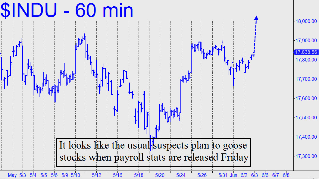 Non-farm payroll numbers are due out Friday, and it looks like DaBoyz are fixing to use the alleged news to put the squeeze on bears. This is not to imply that I can guess whether the numbers will be bullish or bearish. In fact, pretty much all economic news these days is treated as bullish. Lest we get caught up in the frenzy that statistical navel-gazing tends to stir up on Wall Street, however, we should ask ourselves why anyone on earth should possibly care about payroll data. The fact is, no one actually does — except for newsroom flunkies, economists, MSNBC talking heads and assorted other knee-jerk artistes. But that doesn’t stop institutional traders from going bonkers every time the NFP datum is announced. They’re simply frightened by the thought that competitors might get the jump on them by buying the alleged ‘news’ first. _______ UPDATE (June 3, 11:40 a.m.): And go bonkers the traders did, although the move in stocks was down rather than up. This is ostensibly because ‘bearish’ payroll ‘news’ has caused the Fed junkies to reassess their expectations of tightening this summer. Things will be back to normal next week once this shakedown by DaBoyz has run its course.