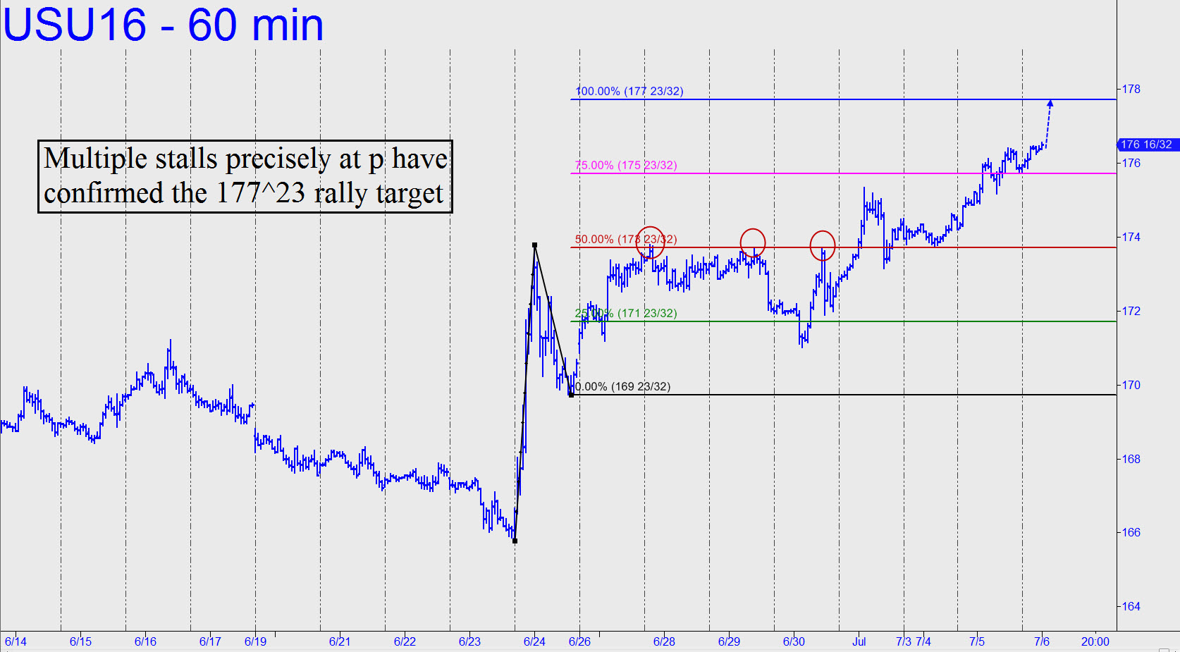 I flagged a 176^03 rally target here yesterday that was the terminus of a bull-market ABC pattern stretching back nearly six months. The relatively minor pattern shown, however, may have more precise implications for the near-term, and therefore be more useful for trading purposes. It can be employed to establish a ‘mechanical’ bid at the red line once that line, a midpoint Hidden Pivot at 173^23, has been exceeded by at least a half-point for several bars. The same goes for the ‘secondary’ pivot at 175^23. (Note: You should attempt these ‘mechanical’ trades only if you understand the tactic.) A stall at p more decisive than what has occurred so far would reaffirm the pattern itself; thereafter, a significant move past it would put the 177^23 target in play. If it’s achieved, it would be a case of a lesser pattern ‘extending’ the reach of a larger one. This doesn’t happen very often, but we should treat it as a possibility here. _______ UPDATE (July 6, 1:11 a.m. EDT): The futures should now be presumed bound for the 177^23 target shown (see inset, a new chart), but don’t expect them to leap this ‘hidden’ barrier with ease, since it has been confirmed, and certified as accurate, by a four-day stall very precisely at the midpoint pivot, 173^23. _______ UPDATE (July 14, 12:23 a.m.): The futures sold off hard after rallying to within 12 ticks of the 177^23 target. Bulls and bears are in a ‘duel’ now on the lesser charts, but the former would gain the advantage with a print above 175^29. That’s the Hidden Pivot midpoint resistance of this pattern on the 30-minite chart: A= 172^00 (6/30); B=177^11 (7/10); and C=173^07. _______ UPDATE (7:08 p.m.): Short-term, the futures are on thin ice, since a dip below 171^29 would breach a June 30 low that is presumptive support.