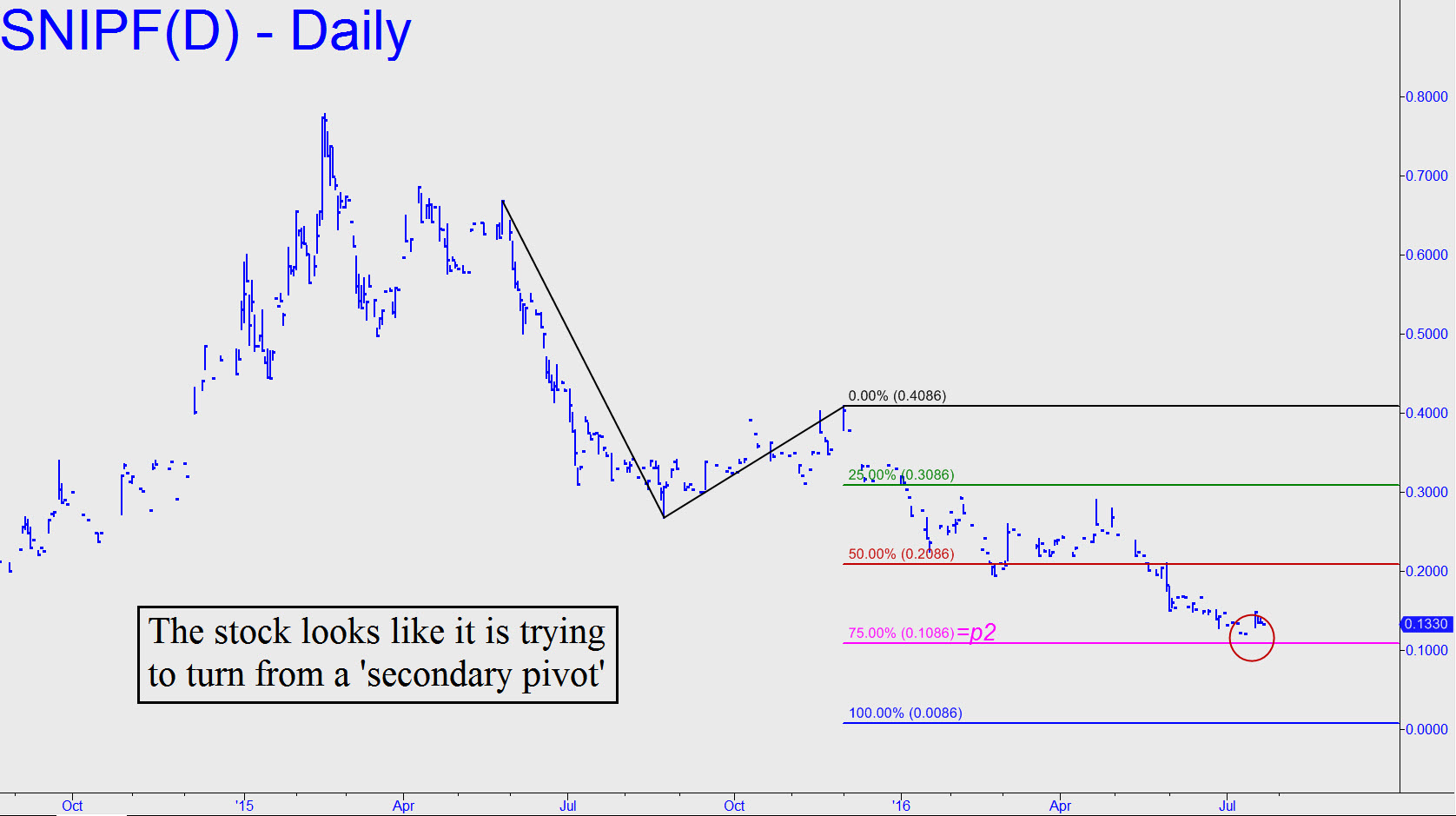I’ve been using a 0.0764 target as a potential bear-market bottom, but the newly drawn chart shown (see inset) supports a less pessimistic outcome — i.e., a bullish reversal from 0.1086, a ‘secondary’ Hidden Pivot support. I continue to hold a third of an original 150,000-share position, most of it acquired between 0.10 and 0.15 in 2014, having passed up an opportunity to take some profits on last year’s sensational run-up to 78 cents. Now, I’m enthused about the prospect of rebuilding the position, especially if the stock comes down to the 0.1086 pivot — or better yet, to 0.0764. Besides the potentially bullish implications of the chart, I am impressed with the way Snipp CEO Atul Sabharwal handled some tough questions posed by shareholders who have been understandably disappointed by the stock’s horrific slide over the last 15 months. To access this Q&A, which has been presented on Snipp’s web site as a FAQ, click here. _______ UPDATE (August 4, 12:46 a.m. EDT): The rally begun on July 11 targets 0.1572 on the hourly chart (a=0.1210 on 7/13), but if buyers can push the stock just a bit higher, surpassing mid-June’s 0.1673 peak, it would be the most bullish thing SNIPF has done in a long while. _______ UPDATE (August 13. 1:02 p.m.) The stock appears to be basing, having spent the last month-and-a-half in heavy chop between 0.12 and 0.15. An upthrust exceeding 0.1680 would imply that bulls are finally getting the upper hand, but I’ll stick with my sub-0.11 bid for now, since the stock’s dismal performance since peaking in February 2015 argues against paying up. _______ UPDATE (August 21, 1:20 p.m.): The stock has been rangebound between 0.12 and 0.15 for two months, but it looks like it will have to go at least somewhat lower in order to get the running start it needs to exit this bog._______UPDATE (August 25, 1:35 a.m.): Please note that 0.1086 is a very important Hidden Pivot support, and that its decisive breach could have very bearish implications for the stock._______ UPDATE (Sep 21, 12:49 a.m.): SNIPF rose more than two cents today — that’s 25% — on big volume, but you can color me skeptical. The company reported receiving a sizable new commitment from a client in the form of a $1.5 million advertising campaign, but one big fish is not going to turn the company around. It wouldn’t surprise me one bit if Canaccord, which has shown enviable instincts for distributing large quantities of Snipp shares at significantly higher prices, was on the sell side. ______ UPDATE (10:07 a.m.): This just in: Gary Singh at Canaccord says his firm was a recent buyer of 2.48 million shares; that he considers the stock a bargain at these levels; and that he ‘might’ buy more between now and Christmas, after a 3-million share dilution involving Hip Digital Media has been discounted. He left a voicemail to that effect for a colleague of mine who in the past has been a large Snipp shareholder.