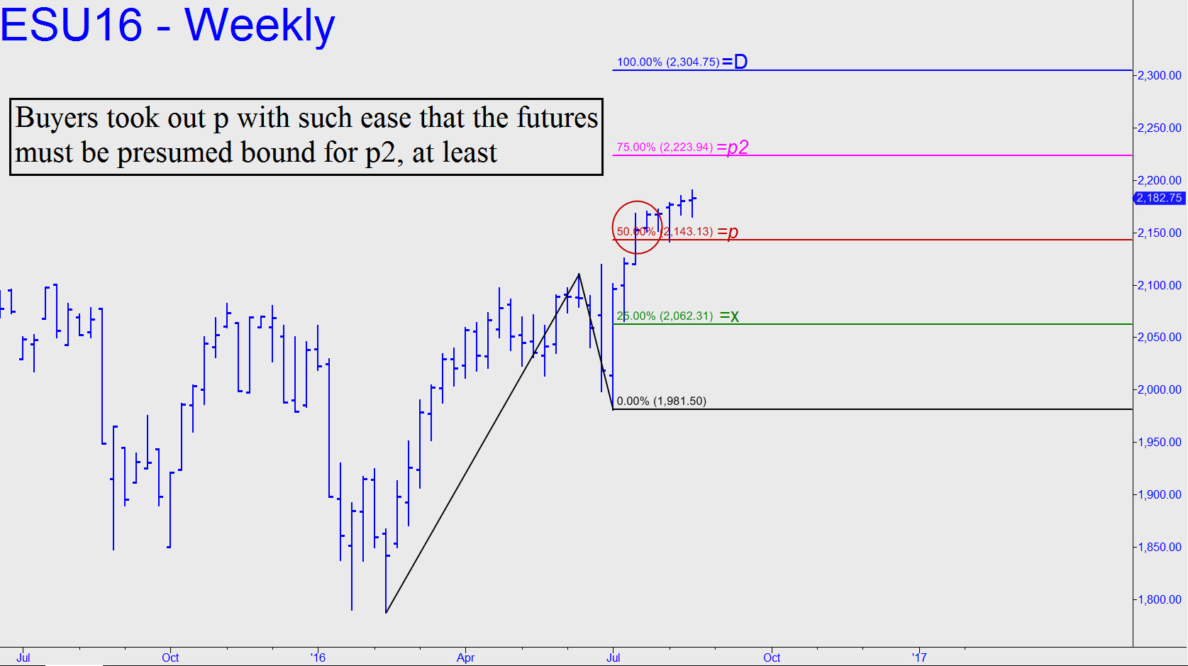 I’m tracking a single-contract short with a profit-adjusted cost basis of 2209.00 and a stop-loss at 2186.25. Today’s chart returns us to the big picture, which shows a bull-market target at 2304.75. A pullback to the red line would be a ‘mechanical’ buy in theory, but in my estimation a ‘mechanical’ entry on a further pullback to the green line (2062.31) would be less risky. We’re not bound to this relatively risky tactic, however, since we can ‘convert’ a mechanical signal to ‘camouflage’ if and when the opportunity presents itself. That would entail waiting at least until next week, when the futures will have spent sufficient time hovering above the red line to vindicate a mechanical bid. Meanwhile, based on the robust look of the pattern and the way buyers blew past the midpoint Hidden Pivot at 2143.13 on the first try, I would surmise the following: The bull market could make its ultimate high shy of 2304.75, but I doubt the final turndown would come before p2=2223.94 is achieved. _______ UPDATE (August 21, 11:45 a.m. EDT): No change. Three days of tedious, gratuitous spasms have yet to push the futures any higher than 2184.50, so our short position remains intact. DaBoyz will keep trying, opportunistically moving this brick higher as soon as conditions favor yet another short squeeze. That is virtually the only source of buying power sufficient to overcome supply when there are no good reasons to own shares. _______ UPDATE (August 22, 7:27 p.m.): Yet another day of pointless thrashing around has changed nothing for us. Rallies haven’t been strong enough to reach the ‘easy’ stop-loss at 2186.25. However, sellers are evidently too enfeebled to push this vehicle down to a just-as-easy 2159.25 Hidden Pivot support based on these coordinates (15-minute): a= 2190.75 on 8/15; b= 2165.50 on 8/17; and c=2184.50. Actually, the selling has yet to even reach the midpoint support at 2171.88, and that’s why I expect the tedium to end with bulls victorious.