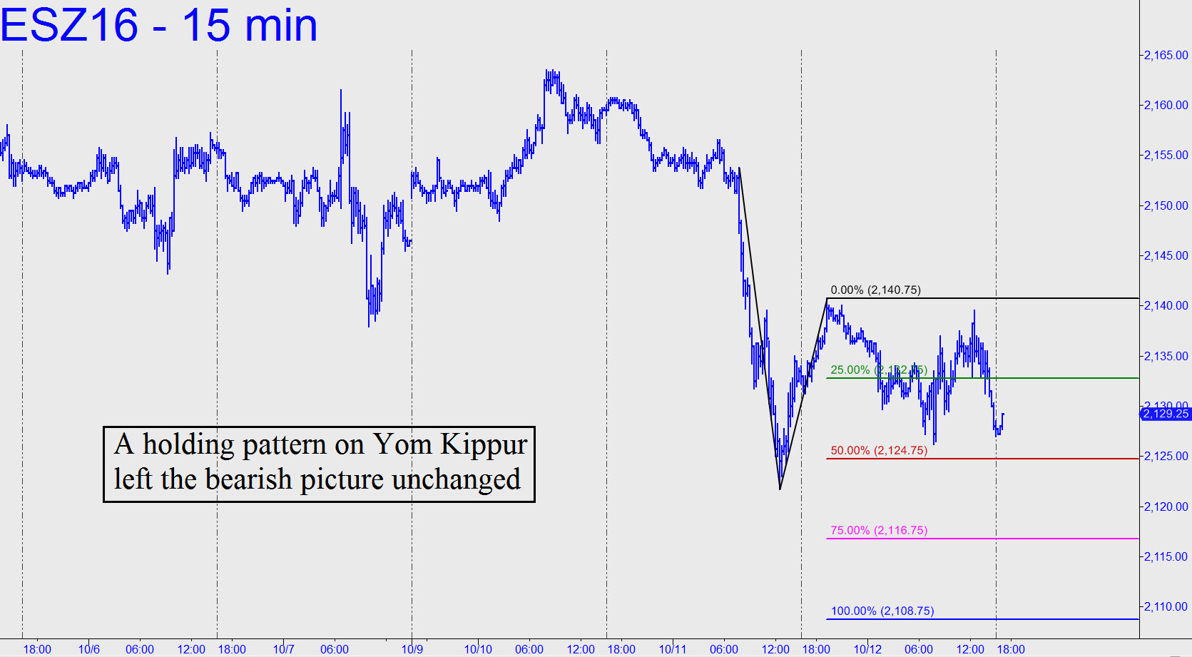 Trading activity slowed to a crawl on Wednesday as Jews around the world observed the Yom Kippur holiday. With stocks in a holding pattern, a bearish technical picture remained unchanged. We’ve been using the 2090.25 downside target of pattern larger than the one shown, but for trading purposes it will probably be more useful to focus on the little stuff, since the lesser intraday charts provide the best tool we have for fashioning entry points with risk under tight control. That implies p=2124.75 should be used as a minimum downside objective for now. If it’s smashed, however, D=2108.75 would be in play, and thence 2090.25. Alternatively, the very short-term picture would turn bullish if DaBoyz can generate enough short-covering to take out the 2140.75 point ‘C’. ________ UPDATE (Oct 13, 1:51 p.m. ET): Bears continue to be their own worst enemy, as well as the only source of buying power strong to heft this brick past resistance. This morning’s bullish, trampoline reversal came from 1.00 point below the 2108.75 Hidden Pivot support noted above. The more important downside target at 2090.25 is still valid in theory and will remain so unless this short squeeze hits 2141.00. However, we shouldn’t discount bears’ well-proven ability not merely to shoot themselves in the foot, but to do so repeatedly with a semiautomatic weapon.