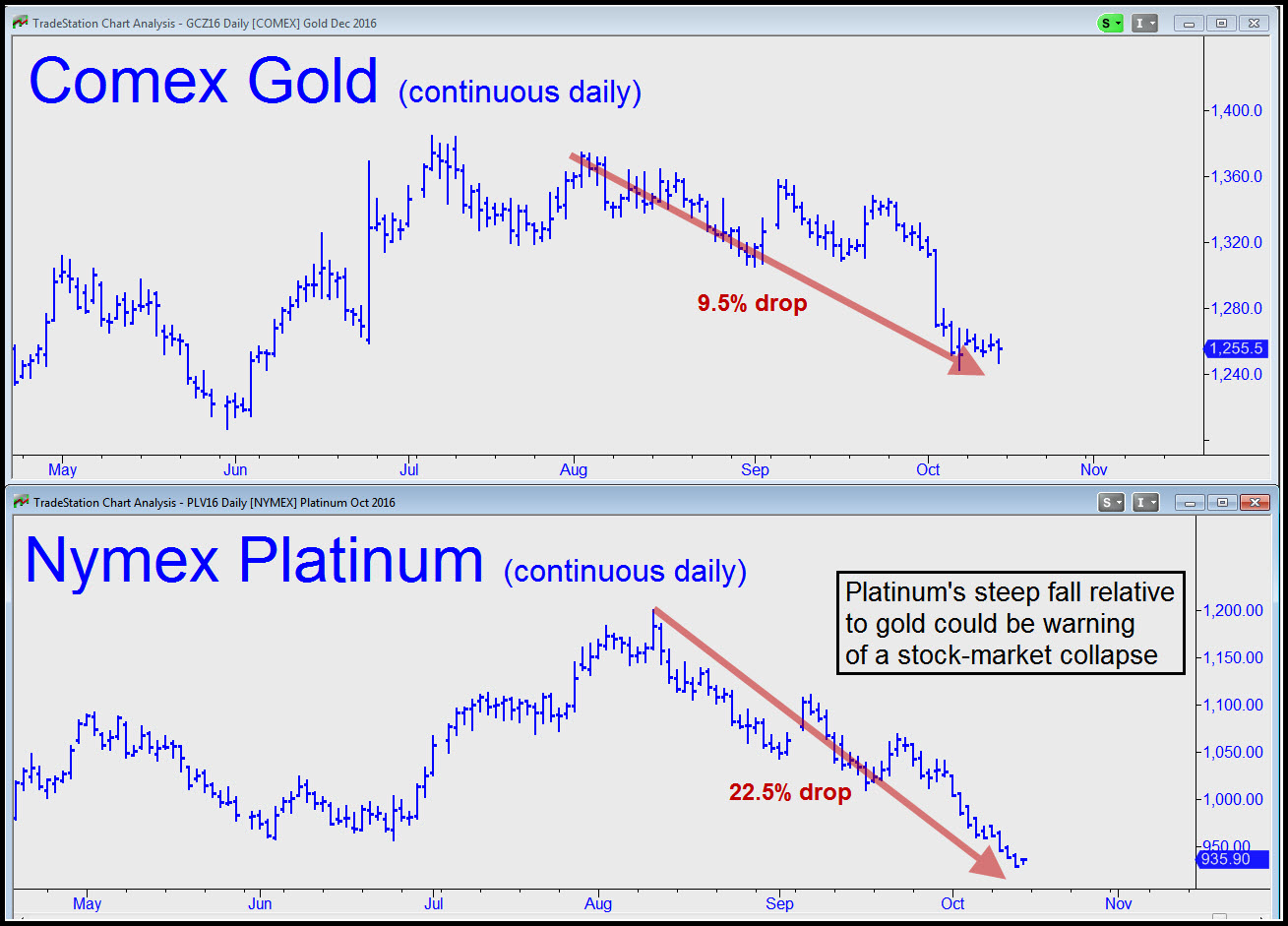 [‘Farmer’ posted the comments below in the Ricks’ Picks forum on Friday, but I am emailing them to all subscribers because his point — that the steep drop in platinum may be warning of a stock market collapse — deserves a wider audience. Farmer has made some prescient calls in the past. He is also the first person from whom I learned, years ago, that pesticides contained neurotoxins that were killing off the world’s honey bee population. His ‘platinum indicator’ could have bearish implications for gold as well, since price action in the former often leads the latter. In this case, platinum’s 22.5% plunge since mid-August has more than doubled gold’s 9.5% drop. This is shown in the charts below. For the record, Rick’s Picks‘ outlook for gold recently turned cautious due to the hard selling that has occurred so far in October. I haven’t given up on the idea that the powerful rally in precious metals begun early in 2016 is the nascent stage of a bull market that will run for years. However, technically speaking, the yellow flag is out, and I am no longer recommending bottom-fishing in mining stocks at this time. The sector looks vulnerable to a further correction on top of the 30% decline that has already occurred. RA]