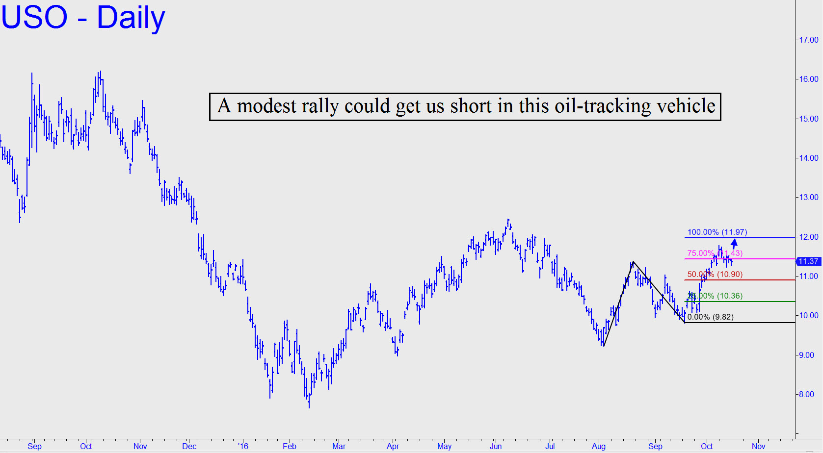 We’ve been looking to get short in this vehicle as a way to leverage a top in November Crude at a Hidden Pivot target that lies just above current levels. USO tracks the daily price movement of West Texas Intermediate light and is therefore a good proxy for crude oil futures. The presumptive final stage of the rally has been a tortuous affair, although the target itself is not in doubt. If we do buy put options they will not necessarily be keepers, since there’s risk that Yemeni/Iranian provocations near the Red Sea link to the Suez canal will escalate to the point where the world’s supply of oil is jeopardized. That could account for the buoyancy in prices since early August despite weakening demand. For trading purposes I am recommending the purchase of four Dec 2 11.50 puts for 0.42 or less, good till canceled. That’s where I estimate they will be quoted if the underlying rises to the 11.97 target shown (see inset). You should check here and in the chat room for updates if it gets close, however, since I may need to raise or lower the bid in order to ensure the small edge we require for all option plays. In no instance should you pay up for the puts, since we’ll be using a tight stop-loss designed to make every penny count. ________ UPDATE (Oct 19, 11:42 p.m.): The puts traded as low as 0.42 today. However, NO ONE SHOULD HAVE BOUGHT THEM, since the point of the trade is to get short using puts IF AND WHEN USO is very close to the 11.97 target. You can buy them using the bid price — BUT NO MORE THAN THAT– that is shown when USO reaches 11.93, assuming it does. Thereafter, stop yourself out of the position if the puts trade for 10 cents less than you paid for them. If you do not understand these instructions PERFECTLY, do NOT do the trade. ________ UPDATE (Oct 20, 7:03 p.m.): Cancel the trade, since the tedium of waiting for the target to be hit has exhausted my patience. There are other factors to consider as well. Even though I still think there will be a shortable pullback from at, or very near, the 11.97 target, the better opportunity may lie in getting long at some point instead. Plus, when USO got within 18 cents of the target today, ‘almost’ achieving my target, the ambiguity of this further diminished the appeal of the trade.