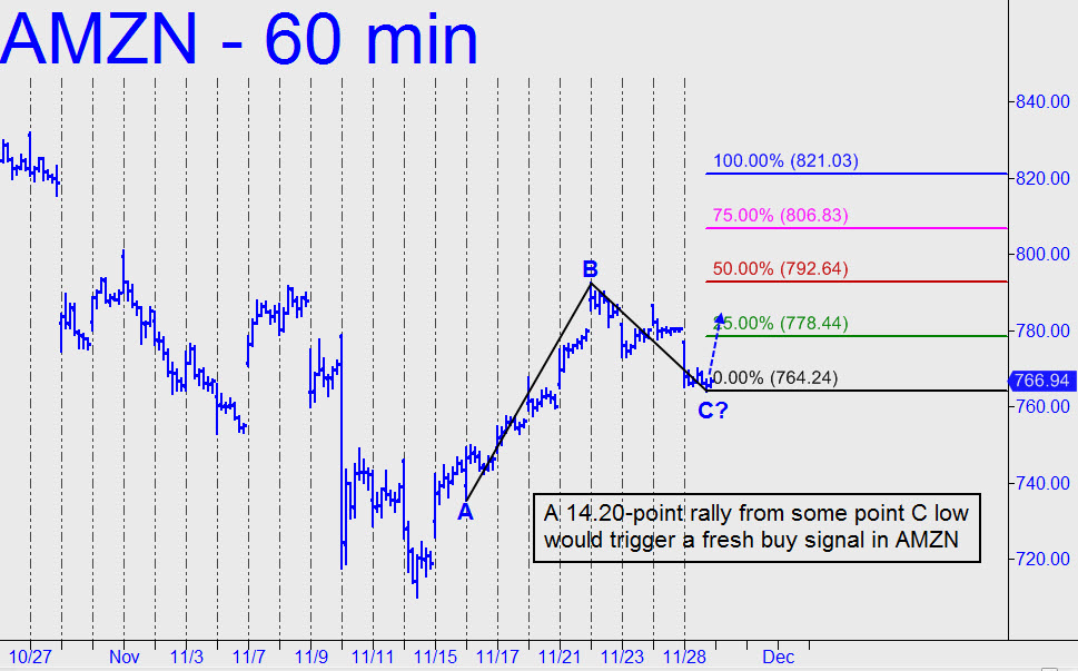 I’ll continue to track AMZN closely, since it is a reliable bellwether for the stock market as a whole. At the moment, signs are bullish, although the stock may have some more correcting to do before it turns higher. The chart shows the ABC rally pattern you should use to trade AMZN when it resumes its upward course. The point ‘C’ low is still tentative, but you can reposition it as needed if the pullback goes lower. A conventional buy signal would be triggered on an rally of $14.20 from the low. We could use the signal to fashion an entry trigger on a chart of lesser degree, with commensurately smaller initial risk.