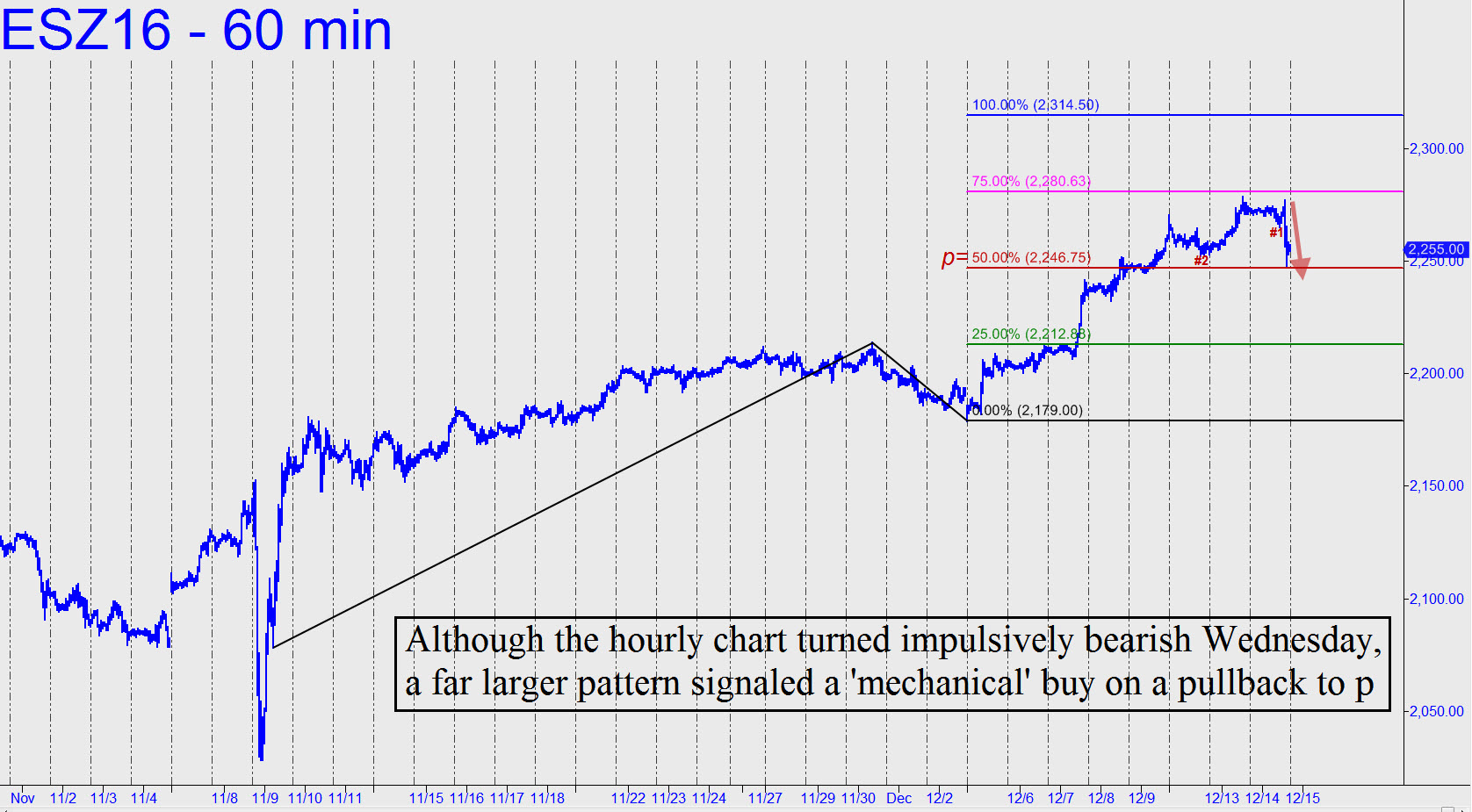 There is a corresponding target at 2299.00 for the December contract, in which we hold a single-contract tracking position that is showing a theoretical gain of about $8000 after adjusting for partial profits taken on the way up. But even if the December futures stall and reverse from 2299.00, the March contract would at that time be trading a decisive 25 points above its 2270.00 target. This would have quite bullish implications into year’s end, at least. Traders should use the pattern shown to exploit any further strength Tuesday night or Wednesday. It shows a minor rally target at 2283.75 that can be exploited with a ‘mechanical’ entry at either the red or green line. If you’re unsure about how this tactic works, stay tuned to the chat room, since quite a few subscribers have been actively trading the E-Minis. As always, an easy push past clear Hidden Pivot resistance should be taken as a sign that the trend will continue at least to the next — in this case to at least 2309.50 (30-minute chart, A= 2075.25 on 11/9; B= 2208.25 on 11/30; and C= 2174.25 on 12/4). That number too has the potential to mark an important top, but bears shouldn’t count on it too heavily, given that the bull market has been chugging along since 2009. If you do plan on shorting there, I’d suggest cushioning the stop-loss with profits made by being long on the way to it. _______ UPDATE (Dec 14, 6:05 p.m. ET): Bears can breathe a mild sigh of relief, since the futures fell to a so-far low of 2243.00 after having gone no higher than 2273.00 (see above). Before you break out the bubbly, though, I’d suggest reacquainting yourself with the hourly chart shown (inset), since it allows for a projection in the days ahead to as high as 2309.50. Your trading bias should be neutral at the moment, since there are some wicked crosscurrents in evidence. Although the selling turned the hourly charrrrrt impulsively bearish, the bigger picture remains bullish and calls for a ‘mechanical’ buy at 2241.75, stop 2219.00. I’ll suggest this trade only for subscribers who made enough on the way up to cover the $1100-per-contract entry risk. (For the record, the tracking position we held in the December futures was stopped out at 2264.75 shortly after 2:00 p.m.. The theoretical profit on the trade was $8875 before commissions.) ________ UPDATE (Dec 15, 9;46 a.m.): Cancel the ‘mechanical’ trade for now, since my gut is telling me there will be a better entry opportunity next week. _______ UPDATE (Dec 15, 7:40 p.m.): The futures rallied after going no lower than the midpoint Hidden Pivot support of the minor downtrend from Wednesday’s top. Coming from where it did, the bounce is incipiently bullish but would become significantly moreso if the week ends with a close above 2273.00. That would put the target at 2309.50 well in play as next week begins.