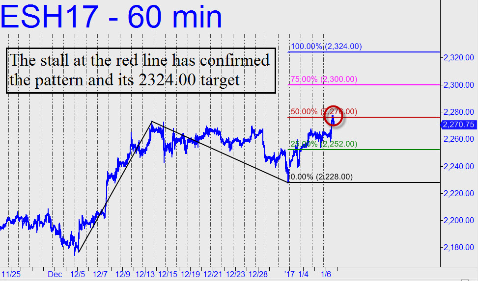 As last week ended, buyers looked to be developing thrust for a push to the 2324.00 target shown. This would equate to a 400-point rally in the Dow Industrials that would put the blue chip average well above the supposed 20,000 barrier. Friday’s stall precisely at the 2276.00 ‘midpoint Hidden Pivot’ implies that if and when buyers move the futures decisively above it — meaning by at least three points — getting to 2324.00 will become an odds-on bet. We’ll look to trade this forecast in both directions: first by getting long for the ride north; then shorting at or very near the target with a tight stop-loss. The top of Friday’s moderate rally exceeded the target by 1.00 point, but that is not quite sufficient for us to infer that a run-up to 2324.00 is a done deal. However, assuming the uptrend resumes on Monday and the midpoint resistance becomes support, we’ll attempt to get aboard with as little risk as possible, presumably by using a ‘mechanical’ bid or a ‘counterintuitive’ entry trigger. If you want to see these tactics at work in real time, tune to the chat room, since there are usually at least a dozen traders in the room who have mastered them. If the trade becomes a ‘go’, it will be posted on The Scoreboard in timely fashion so that all subscribers can take advantage. _______ UPDATE (Jan 9, 8:37 p.m. ET): The futures are in a weak decline in after-hours trading after buyers failed to surpass 2276.00. I posted a ‘mechanical’ buy intraday but subsequently scratched it rather than face a possible swoon engineered by DaBoyz overnight or on the opening bar. They will need a running start to hit new highs in any event, but they’ll need to do it without an assist from the newsfeed, since there are no announcements of particular interest on Tuesday’s Econoday calendar. _______ UPDATE (Jan 10, 1:09 p.m.): This erstwhile rabid badger has repeatedly demonstrated that it is easily tradable via ‘counterintuitive’ signals. My suggestion would be to get while the gettin’s good, since the algos are going to discover our little secret sooner or later. The fact that the trick still works is ample proof that they are not yet onto it. It also adds to the evidence that we can and should initiate counterintuitive trades when C=A). FYI, this morning’s juicy opportunity came off a counterintuitive trigger around 9:00 a.m. at 2264.25 (A=2258.25 on 1/6/ 60-minute). Present target: 2278.35. ________ UPDATE (7:12 p.m.): Even with a running start and a short-squeeze opening bar, the futures somehow still failed to reach the modest, 2278.35 rally target we we used today to keep us on the right side of the market. Technical signs remain bullish, but I’ll suggest trading this vehicle only if you’re looking to test your ‘counterintuitive’-entry skills against nonsense. If the futures pop in the first hour to 2282.50, you can short there with a three-tick stop-loss.