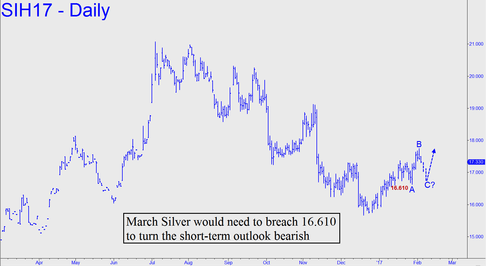 March Silver continued to forge higher on Tuesday, pausing exactly at a 17.635 target that I’d flagged in the chat room at 9:56, when the futures were trading 15 cents lower. When they subsequently corrected by 19 cents, I put out a second ‘buy’ signal tied to a nominally higher target at 17.645 that has yet to be reached. This contract has obviously been very cooperative in moving to Hidden Pivot targets lately. As such, we should look for the next thrust to hit 17.735 (see inset), and thence 18.115 if any higher. The pattern shown can be used to generate ‘mechanical’ entry signals both from the long and short side. As always, and easy move through clear Hidden Pivot resistance will imply a continuation of the trend to the next. And to what heights, we might ask, if 18.115 is impaled? I’ll hold off on that target for now, since it seems a little too ambitious to me at the moment, and I don’t want to stir up the sort of bullishness that could turn subscribers incautious._______ UPDATE (Feb 2, 1:18 p.m.): Silver looks slightly more feisty than gold, but I’ve revised the chart to show the pattern we should be using at the moment in any event. It provides a conservative assessment based on the last six bars while keeping us focused on a short-term outlook that will remain bullish unless the futures fall beneath 16.610.