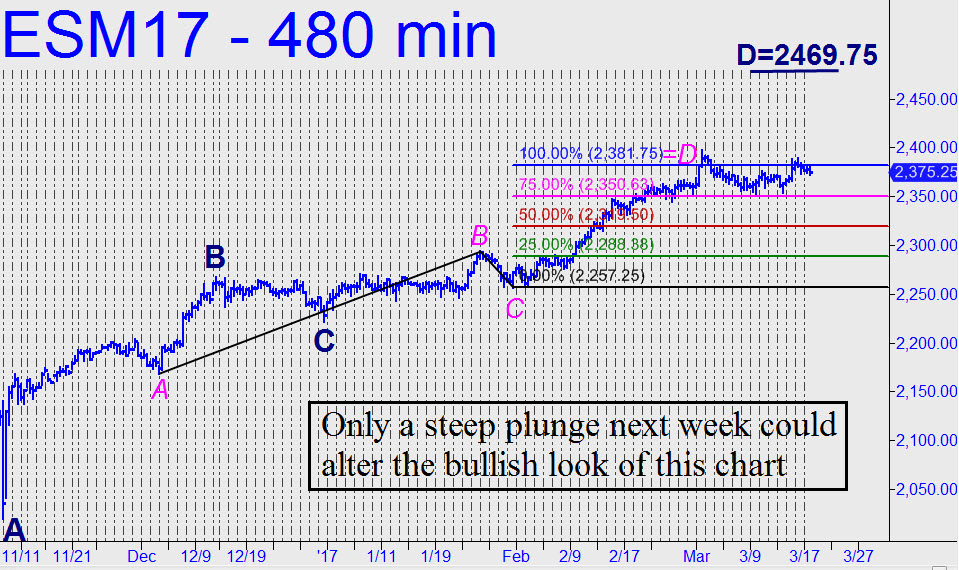 Today’s chart (click on inset) is persuasive on the matter of whether the S&Ps are likely to move higher. This seems probable, although not necessarily right away. The June E-Mini contract has pushed past a clear Hidden Pivot target at 2381.75, implying under our rules that it is being acted on by a pattern of larger degree. The rally target of that larger pattern lies at 2469.75, a 94-point thrust that would equate to a Dow move of about 800 points. Even so, we bought DIA puts at these levels because a target of even larger degree had been reached within two points. I like the odds, because the raging bull has been acting tired lately and even a few days of moderate selling could double the value of puts that subscribers acquired for an average 92 cents.