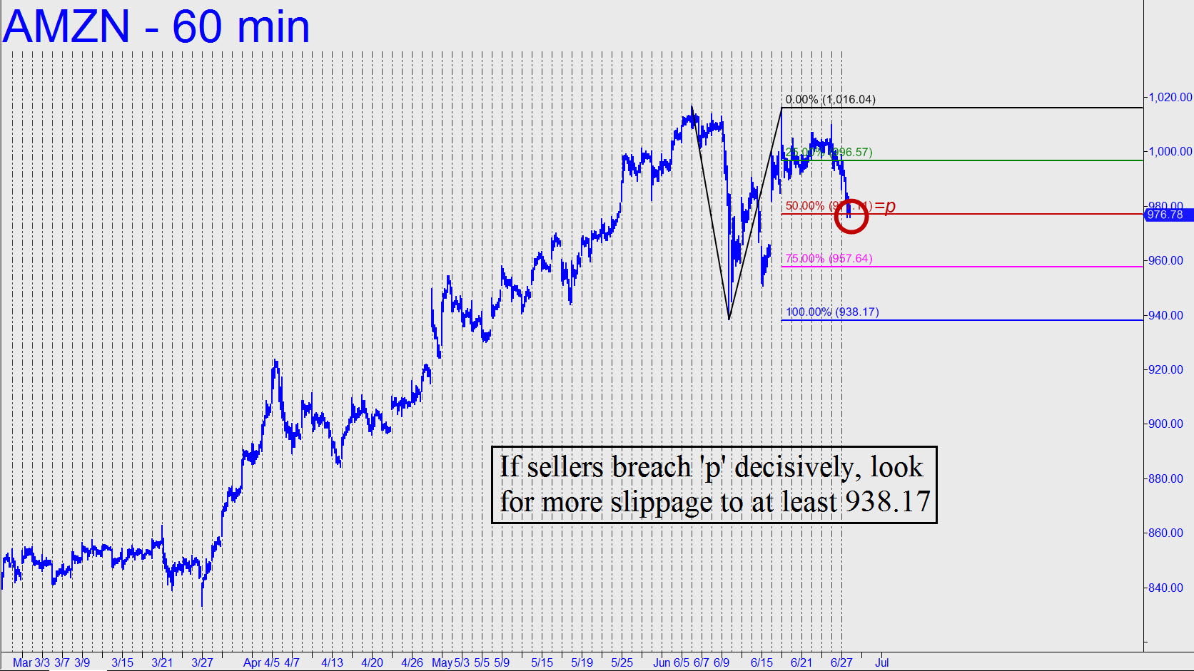 Sellers on Tuesday daintily probed the 977.11 ‘midpoint’ Hidden Pivot support shown in the chart, validating the bearish pattern as well as its 938.17 target. We’ll wait for the support to give way, assuming it does, before we infer that the weakness is likely to continue down to at least 938.17. Were this to occur, it would assuredly be simultaneous with continuing weakness in the broad averages, most particularly the Nasdaq. Alternatively, if buyers recover their recent bravado, this erstwhile world-beater in rally mode would still face jeopardy in the form of a daunting Hidden Pivot resistance at 1024.83 (60-minute, A=930.30 on 5/5). I have higher targets outstanding, including one at 1083 that should be familiar to you, but for now we’ll take our projections one minor trend leg at a time, since we want to get this one exactly right if the downturn is about to turn ugly.