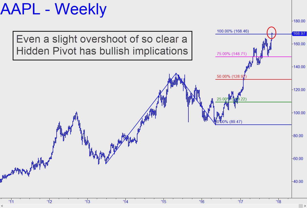 AAPL chomped through a very long-term target at 168.46 on Tuesday, implying that the stock’s spectacular rise is likely to continue, if not necessarily quite as steeply. This would hold bullish implications for the U.S. stock market, since AAPL by capitalization is the largest company in the world. So far, buyers have overshot the target by just $1.19. However, considering the beauty and precision of the pattern that produced it, this Hidden Pivot should have stopped bulls in their tracks. Instead, they seem not to have noticed it. Yes, it’s possible AAPL will go no higher than today’s record 169.65, and we should therefore be alert to the possibility of a sharp drop from these levels. But my bias remains bullish for now, acknowledging potential on the monthly chart to 181.11 most immediately, or even to 211.65 longer-term. ______ UPDATE (Nov 12, 6:06 p.m.): AAPL spent the week in a stall that must have disconcerted bulls, given the height at which the stock has been doing its aerobatics. Its behavior would turn mild menacing for a rare change if the stock should fall beneath 171.72 by mid-week.