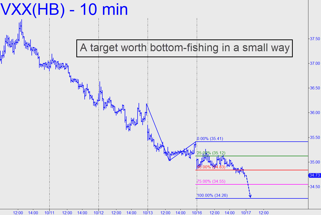 The fact that so very clear and compelling a target as the one at 35.48 was exceeded at all, let alone by a whopping 0.45 points the first time it was touched, strongly implies that lower prices are coming, perhaps significantly lower. Specifically, and assuming the stock market has not crashed Sunday night, I am shifting my gaze to the 26.32 target shown. That such hitherto unfathomable depths will be achieved is difficult for me to imagine, since it implies that the S&Ps are about to ratchet much higher, extending their hyperbullish parabola for yet another four to six weeks. Yes, there’s always the chance that the secondary pivot at 33.81 (see inset) will turn the tide. But the new pattern looks too pretty for us to avoid the conclusion that VXX will eventually fall to an all-but-unthinkable 26.32. As is our custom, we will take no position in the interim, since doing so only at major Hidden Pivot supports has saved us a lot of stress — and money — as VXX has continued to carve out historical new lows routinely for months.______ UPDATE (Oct 16, 10:52 p.m. ED): Yes, I know, I said I would recommend bottom-fishing only at major targets. But this one looks so juicy that I’m going to suggest buying a couple of Oct 20 calls at the 35 strike if VXX gets within 0.04 of the 34.26 target. Stop yourself out if it trades below 34.20, since this support is going to work precisely if at all. _______ UPDATE (Oct 17, 7:32 p.m.): Just one change: Buy Oct 20 options at the 34.50 strike. We’re not leaving ourselves much time, so don’t get in any deeper than you can afford to lose without pain. I am not suggesting going out to Oct 27 because the target that we’re bottom-fishing is not important enough to warrant the extra week._______ UPDATE (Oct 18, 9:27 p.m.): Cancel the order, since I don’t fancy having our patience tested any more than it has been tested already, especially for a trade that was no big deal to begin with.