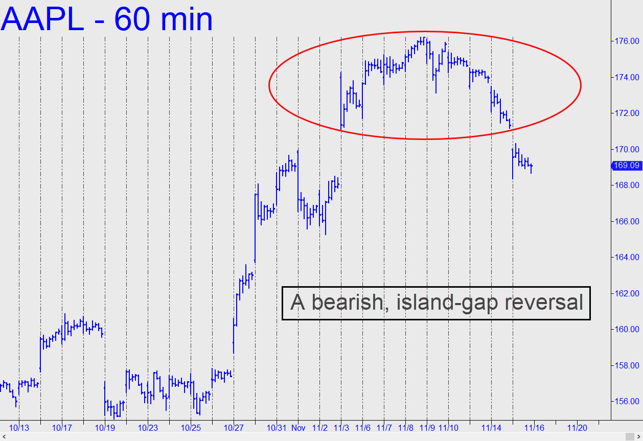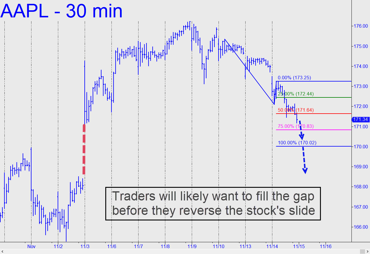 Buyers have gone soft nearly $5 shy of the 181.11 Hidden Pivot we were using as a minimum upside target. After climbing no higher than 176.24, AAPL has come down hard since last Wednesday and now looks like a good bet to fall to at least 170.02 before it finds traction. At that point the stock will be feeling an urgent downward tug to fill the 3-point gap that occurred on November 3. If in fact things play out that way, the stock market is certain to get dragged lower too, since the broad averages rarely go their separate way when AAPL is feeling blue. Since sellers have long lacked the moxie to strike hard when things are going their way, and because the buy-the-dip mentality is probably as strong as it ever has been, we may be in for a boring stretch. _______ UPDATE (Nov 15, 10:08 p.m.) AAPL did in fact fill the gap noted above, with an opening bar that touched 168.38. The subsequent bounce looked like sucker bait, so expect the stock to fall even lower today. A logical minimum downside objective would be 165.25, where Apple shares bottomed on 11/2 ahead of a sharp, fleeting rally. The net effect, ignoring overnight bars, is a bearish island-gap reversal pattern shown here. _______ UPDATE (Nov 16, 5:14 p.m.): The so-far two day bounce has yet to exceed any prior peaks even on the lowly 15-minute chart, so it remains suspect. A print at 172.14 would tip the short-term outlook mildly bullish, but 173.26 would be significantly better.