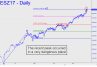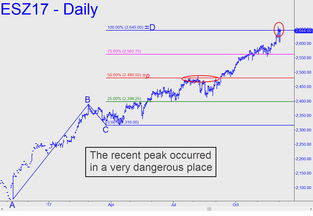 Based on evidence that comes from a composite chart, we’ve been using 2690.25 as a possible place for the bull market to end. However, referencing the December contract, the futures have already topped via a thrust last week to 2658.50 that roundly exceeded the 2645.00 target shown. Is the 13.50-point overshoot sufficient for us to presume that another bull leg is likely? Ordinarily I’d say yes, especially given the clarity of the bullish pattern and the fact that buyers stalled precisely and very discernibly at p=2480.50 before blasting though it. But just to be cautious, we’ll keep an open mind to the possibility that the S&Ps have made an important top, if not necessarily THE top. If this proves to have been the case, we should start to see downtrending abcd patterns exceed their ‘d’ targets immediately and in all time frames. Alternatively, if the December contract is about to head higher, it will close above 2650.25 for the next day or two, then blast off for a minimum 2690.25. (daily chart, A= 2567.75 on 11/20). _______ UPDATE (Dec 3, 9:47 p.m.): The bullish herd has gone loco tonight — on a Sunday, no less — pushing the futures to a so-far high at 2663.25. This negates the potential usefulness of everything I’ve written above save the 2690.25 target, which remains in play.