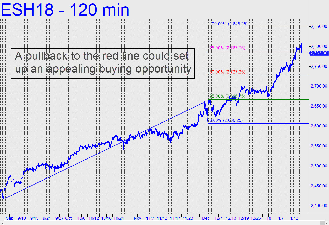 Buyers did something on Tuesday that we don’t see very often these days, pausing for a few hours in their manic scramble to own every share they can get their hands on. Bears, with the wind at their backs for a rare change, failed for the umpteenth time to seize the advantage. When the dust settled, the futures had closed off a whopping nine points after being down as much as 20 points intraday. Oh well. Since a second day of accelerating weakness seems most unlikely, we’ll stick with the 2824.00 rally target given here earlier — or 2848.25 if any higher. Buyers can use a ‘mechanical’ set-up to generate a bid near the red line (p=2725.25), but I’d suggest using ‘camouflage’ on the one- or three-minute chart to do the actual trade, since the entry risk otherwise would be $2016 theoretical per contract. Stay close to the chat room if you seek guidance for this in real time. If the stock market startles by going lower we can sit back and enjoy the show, since many subscribers still hold soon-to-expire VXX calls purchased a couple of weeks ago for an average o.67. If the broad averages sell off as hard as they did for a while on Tuesday, those calls could triple in value in an hour. ______ UPDATE (Jan 17, 4:22 p.m.): No change. At the rate stocks are climbing, the E-Mini S&Ps should reach the 2824.00 target by no later than early Friday. It would equate to a 500-point rally in the Dow. Of course, none of us will be the least bit surprised when the target is reached, but what might surprise some observers is how quickly this will have occurred. Please note that once 2824.00 has been exceeded by more than 1.50 points, the 2848.25 Hidden Pivot resistance will become an odds-on bet to be reached.