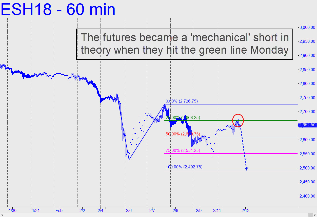 Today’s chart is the one I’ve been trading for the last week. It is bearish, with an unfulfilled downside target at 2492.75 and a worst-case low of 2377.25. If you play it strictly by the Hidden Pivot rule book, the futures became a ‘mechanical’ short when they rallied to the green line (2668.25) near the end of Monday’s session. Since the trade calls for a stop-loss at 2727.00 that would risk nearly $3000 per contract initially, I would tend to use charts of much smaller degree, ‘camouflage’-style, to pare the risk of getting short to more like $60-$100 theoretical. I offer the chart not for your explicit trading guidance, but to allow you to see more clearly the bearish framework within which the rally from Friday’s low has proceeded. I am not persuaded strongly either way as to whether a bear market has begun, although my gut instinct leans in that direction at the moment. I would feel more strongly about it if: 1) the mechanical short from 2668.25 goes on to become a big winner; and, 2) the implied downdraft easily exceeds the 2492.75 target. In any case, I will continue to trust my technical runes above all, since they are free of the emotions and dubious citations of fact that are dominating public debate right now. From a practical standpoint, getting a good read on the bull/bear will require paying attention to one simple piece of evidence, to wit: If downtrending, ABC-type corrections start to exceed their ‘D’ targets, and upward ABC patterns start to fall short of theirs, that would shorten the odds that we are indeed in a bear market. Stay tuned if you care. _______ UPDATE (Feb 13, 8:17 p.m. EST): Despite the bearishness of the analysis above, it’s possible to interpret Tuesday’s price action as bullish, albeit to a lesser degree. The futures tripped a ‘mechanical’ buy signal when they dipped to the green line. Notice that if they go on to reach the 2708.50 rally target, that would still fall shy of the 2726.75 threshold needed to invalidate the larger, bearish pattern shown in the original chart (click on thumbnail inset).