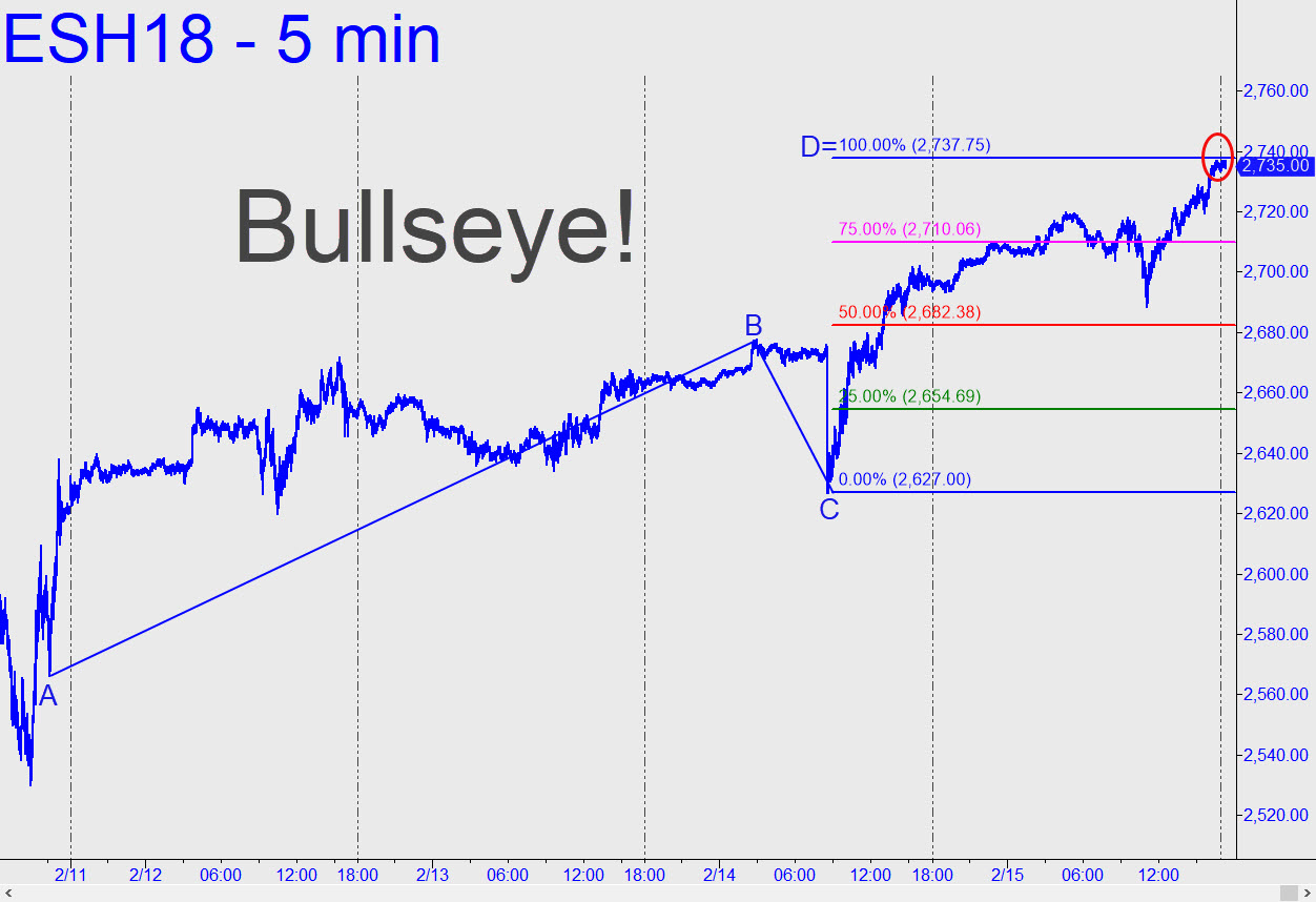 The futures rallied 50 points off their lows Thursday, topping a single point from the 2737.75 target I’d sent out to subscribers the night before. At the time, I’d suggested getting long with a ‘mechanical’ bid at the green line; alas, the pullback from overnight highs didn’t even come down to the red line, a midpoint Hidden Pivot at 2682.38. Even so, those who drilled down to the very lesser charts in search of a ‘camouflage’ entry setup as I’d advised were rewarded with a trade signaled as early in the rally as 2692.25. The trigger point is shown here, and getting long would have risked just 1.00 point ($50) theoretical per contract. So where are the futures headed next? To at least 2758.88, as far as I can surmise. Expect a potentially tradable pullback from that Hidden Pivot, but if it is decisively exceeded or the futures close above it for two consecutive days, it would put a 2988.75 target in play. That would be 115 points above the old record high — equivalent to 1000 Dow points. _______ UPDATE (Feb 18, 5:08 p.m. EST): Friday’s rally peaked within four points of the 2758.88 resistance, but this caused no change in my guidance.