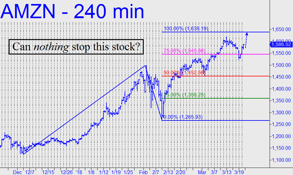 We’re staying close to AMZN because it can tell us everything we need to know about the bull market, its institutional sponsors and their exact state of mind at any given moment On Tuesday, the Masters of the Universe ran ’em up shorts’ ol’ wazoo, goosing the stock $62 above the previous day’s lows. This has of course improved the odds of a finishing stroke to the 1639.19 target shown. I hadn’t given up on it, but last week’s plunge seemed to put it out of easy reach; now, it’s just one middling short-squeeze away. The broad averages will be unable to fall if this occurs. However, we won’t allow ourselves to get caught up in AMZN’s ebullience, since the stampede could easily end at 1639.19, a clear and compelling Hidden Pivot resistance. I’ll suggest buying a few out-of-the-money puts with a week or two left on them if and when AMZN gets there, but treat this as a speculation, wagering no more than you can afford to lose painlessly. In the meantime, I’ll keep a close eye on the lesser charts, since I’d hate for us to be caught unprepared if the stock turns lower, possibly headed to sub-$1000 hell, without having achieved such a crystal-clear target. ________ UPDATE (March 23, 12:18 a.m.): Today’s nasty reversal signaled more downside to at least 1508.91. Let’s see if this relatively minor Hidden Pivot support can contain sellers. Here’s the chart. Please note that a rally to the green line would trip a mechanical short there, stop 1590.01. _______ UPDATE (March 23, 2:46 p.m.): The stock bottomed this morning at 1509.00 — just nine cents from the Hidden Pivot target flagged above — before trampolining $22 higher. No one mentioned having used the target to get long, so I haven’t established a tracking position. If this is incorrect, please let me know in the chat room and I will provide further guidance.