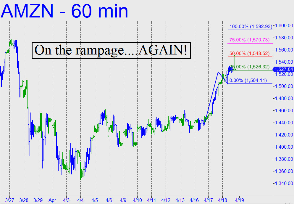 The stock is currently trading $48 above Wednesday’s closing price, which was $24 above Tuesday’s closing price. Although the rally seems likely to adrenalize the broad averages, it raises serious doubts about whether the stock market can keep up with with AMZN’s not infrequent wilding sprees. Probably not. But as I have continued to emphasize, the stock market can do no worse than move sideways as long as the shares of the world’s most economically important company are moving higher. Most immediately, if AMZN can exceed the 1576.65 peak labeled in the chart, it will shorten the odds of a further rally to new all-time highs. In fact, my minimum upside target at the moment, based on the Hidden Pivot Method, is actually higher than that: 1592.23. (Bulletin: Pivoteers may notice that the stock generated a ‘mechanical’ buy signal moments ago with a swoon to the green line.) I am skeptical that this kind of craziness can continue for much longer, and that is why I will be monitoring AMZN’s technical vital signs closely for subtle evidence of a top. It is a truism that every bear market has begun with a tiny, downtrending abc pattern on the one-minute chart. As long as we stay focused on the lesser charts, we cannot be fooled for long, nor are we likely to get trapped when They finally pull the plug._______ UPDATE (April 19, 6:07 p.m. EDT): AMZN’s canny sponsors opened the stock on a short-squeeze gap that peaked at 1568.52, an inch shy of the 1576.65 benchmark flagged above. The pullback was shallow, so we should expect another attempt overnight or on Friday.________ UPDATE (April 22, 5:04 p.m.) Buyers spent the week lazily building a modest hump atop the 1528 midpoint Hidden Pivot shown. This is bullish, but not very. Although it has put the pattern’s 1704.49 target theoretically in play, the implication is that AMZN will be in no hurry to get there. A pullback to the green line (1440.78) would trip a mechanical buy signal, but we’ll wait until it happens before we decide how to leverage it.