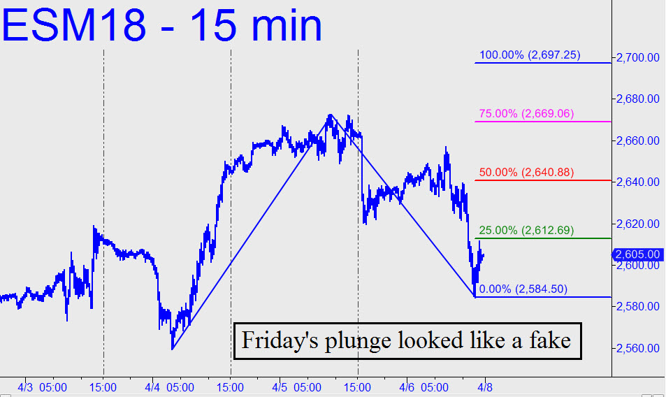 The June contract was down a whopping 78 points on Friday at its nadir, but from a technical standpoint it was just noise. Since the selloff was prompted by Trumped-up news concerning the President’s latest thoughts on tariffs, perhaps we should have bought the decline hand-over-fist. One other reason we might have had for doing so was that all of the lunatic stocks — i.e., the small handful of turbo-charged stocks portfolio manages use to hyper-leverage the epic hoax of a sustained bull market — appear to be in conventional bullish corrections. Accordingly, I’ll suggest using the chart (inset) as a road map when the new week begins. It’s always unpredictable how DaBoyz will play their cards Sunday night, but my hunch is that merely moderate weakness would be a sign the Masters of the Universe are eager to buy ’em ahead of Monday’s opening bell. Since we should always allow for an alternative scenario, let me add this: If the futures open down more than 20-25 points, bulls could be in for another rough day, whether attributable to tariff headlines or not. _______ UPDATE (April 9, 1:10 a.m.): DaBoyz could not contain their gluttony Sunday evening and have opened index futures with an unabashed lurch higher. For now, use the 2640.88 midpoint Hidden Pivot shown in the chart as a minimum upside target. ______ UPDATE (1o:41 a.m.): Target hit and slightly exceeded. I will update with a new target if there’s a request for it in the chat room.