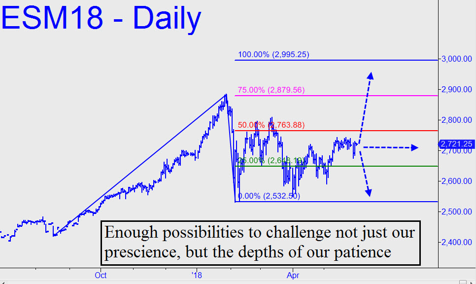 The ‘mechanical’ trade implied is a specialty of Rick’s Picks because it has worked so consistently for subscribers. Without going into the proprietary details of why the ‘mechanical’ buy shown is such a beautiful specimen, I’ll say only that it leaves little room for doubting bulls, let alone for permabearish skeptics like myself. A key feature of such set-ups is that they excel at handling the scary, second-wave dive that so frequently interrupts otherwise very-bullish-looking charts. In this case, the all-but-obligatory dive took the E-Minis down by nearly 10% in March, narrowly missing a theoretical stop-loss that would have triggered just beneath 2532.50, the pattern’s point ‘C’ low.