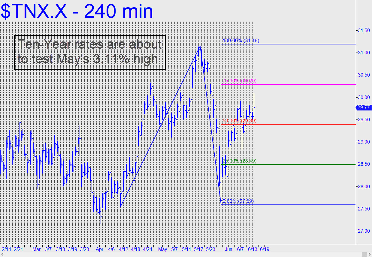Because mid-May’s multiyear high at 3.11% precisely achieved a target I’d put out five months earlier when rates were around 2.35%, I was open to the possibility that yields had made a major top. This seemed even more likely when the Ten-Year Note plunged to 2.76% over the next 12 days. Now, however, a strong recovery rally has shortened the odds of a move to new highs. If it is coming, it would generate headwinds above 3.25% sufficient to slow the U.S. economy or even suffocate it, since rates for mortgages and car leases would rise as well. At the very least, based on the chart shown, Ten-Year Note yields look very likely to challenge the May high, since the target is actually 0.04 points above it. The rally could turn out to be a bull trap, either by forming a double top or, less likely, an upthrust to new heights that reverses precipitously. A third possibility is that, once above May’s highs, rates will continue to rise. Whatever the case, I will be monitoring this vehicle closely, since a move into the 3.25%-3.50% range would significantly reduce the flow of oxygen to the U.S. economy’s heart and lungs — i.e., housing and autos.