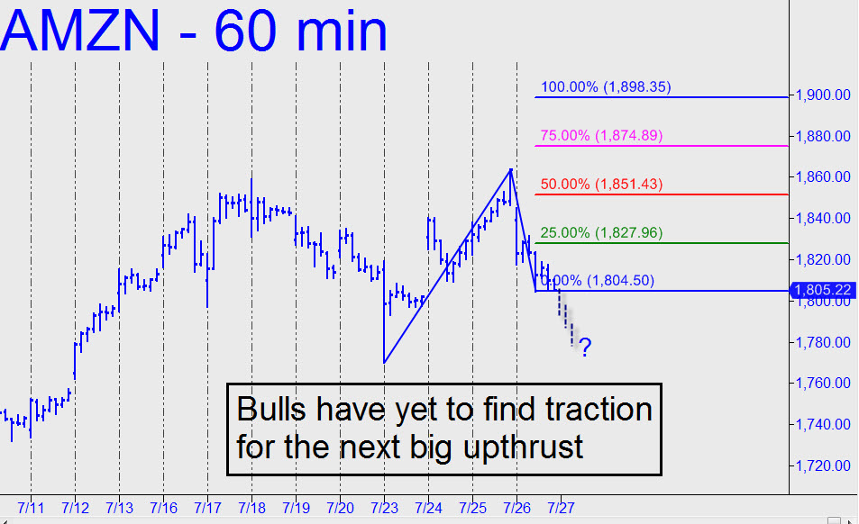 I’ve used larger patterns that the one shown (see inset) to project targets at, respectively, 1946 and 2007, but to be especially cautious I’ve shrunk my perspective to produce the 1898.35 target in today’s chart. Technically speaking, the target does not yet exist, since that would require a bounce to the green line. However, if and when the point ‘C’ low is in we can use the same pattern to get a precise handle on AMZN’s next big upthrust, assuming it comes. I continue to track AMZN closely because if we get it right, we have a better chance of getting the stock market right. The international scope of Amazon’s operations make the retailing giant a crucial economic bellwether not just for the U.S., but for the entire world. ________ UPDATE (July 27, 1:43 a.m. a.m. a.m. EDT): The stock has rocketed 95 points on record earnings reported after the close, hitting a so-far high at 1895.00 that lies just a few points from the target I’d flagged above. The pullback since has been shallow, suggesting AMZN is capable of taking another leg up when the regular session begins on Friday. Until then, we should expect AMZN’s canny handlers to shake loose some shares with an engineered swoon. Wish them luck, since shorts appear to have their cojones caught in the ringer.________ UPDATE (July 27, 9:45 a.m.): Buyers hurled themselves at the 1898.35 Hidden Pivot again overnight, retreating sharply after getting no higher than 1896.40. Shorts are still trapped, but it is unpredictable at the moment whether they will succumb or prevail today.