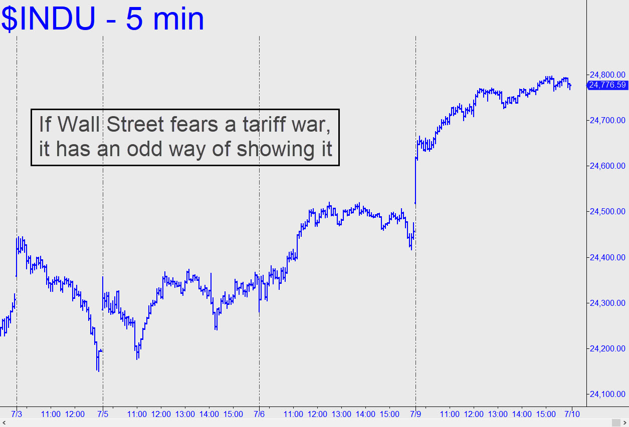 I’ve asserted here many times that the stock market’s ups and downs drive the news rather than the other way around. This implies that if shares are in a strong rally, we tend to shade our interpretation of the headlines more bullishly. But what if stocks are going nuts in the face of indisputably bad news? That is currently the case, and the seeming paradox is so extreme that it all but settles the argument about whether the stock market’s tail wags the news media’s dog. What we are seeing is a ballistic surge in the broad averages even as the mainstream media bombard us with the grim certitudes of a mounting global trade war. Seldom has the disconnect between news and stocks seemed more perplexing.