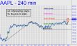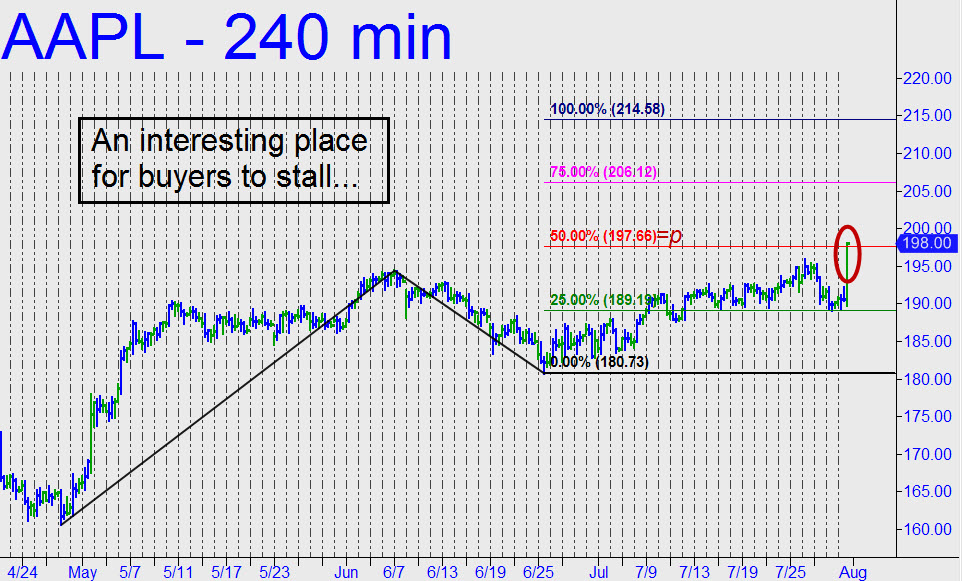 AAPL’s $8 surge in after-hours trading has stalled in an interesting place, a hair from a midpoint Hidden Pivot at 197.66. A decisive penetration of that resistance would imply more upside to the 214.58 target shown. We’ll probably know soon whether buyers have the moxie to push the stock a total of 12% higher on upbeat earnings news that came out after Tuesday’s close. I have my doubts AAPL will reach the target — but then, I’ve never been impressed with the company’s overpriced hardware, nor with ‘genius’ support that could never explain why iTunes at times acted almost like a virus on Windows-based systems.