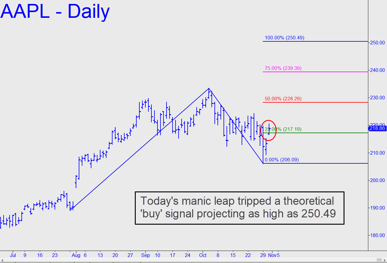 AAPL’s canny sponsors began the day coaxing a manic leap from panicky bears. The short-covering gap tripped a theoretical buy signal at 217.19 that is predicated on a further rally to at least 228.39, the midpoint Hidden Pivot of the pattern shown.. Once decisively above it the stock would be an odds on bet to reach the ‘D’ target at 250.49. We’ll ignore the trading signal for the time being, but not the stock’s feistiness, since AAPL is, as we know, is the most valuable company in the world, owned by nearly every portfolio manager on the planet. That is why it is not going to crash simply because the stock market has developed a case of October sniffles. We’ll follow this dirigible closely, since, all by itself, it has the power to hold the U.S. stock market aloft for as long as the institutional chimps continue to buy-and-hold it, and Apple continues to buy back its own shares._______ UPDATE (Nov 1, 10:14 p.m. ET): The stock is getting whomped in after-ours trading Thursday following a punk earnings forecast for the holiday season. AAPL has fallen 7% so far and could go even lower if it achieves the 203.88 target shown.