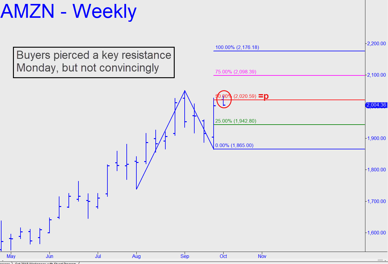 Get AMZN right, as I have said here repeatedly, and you get the stock market right. We’ve been using a rally target at 2059.15 as a minimum objective, but today’s chart (see inset) shows a bigger-picture target at 2176.18. This Hidden Pivot resistance lies 8.5% above current levels and should be considered an odds-on bet to be reached if and when the 2059.15 midpoint pivot has been decisively penetrated. Notice, however, that buyers recently stalled very near that number and that the stock subsequently relapsed, albeit only mildly so far. We should keep this impediment firmly in mind as the stock flirts with it in the days, or perhaps weeks, ahead. If at any point buyers are perceived to have blown past it, take it as a sign that AMZN is effortlessly on its way to 2176.18. This presumably would drag the FAANGs and the broad averages significantly higher, at least until the target is reached._____ UPDATE (Oct 2, 8:03 p.m.): Although there is still the strong presumption that the stock is headed significantly higher no matter what happens in a given day, its downturn on Monday from a high that did NOT surpass a prior ‘external’ peak deserves our cautious attention. The move was bearishly impulsive on the hourly chart, but we’ll need to see a retracement and a second leg down before we can confidently assess bulls’ mettle._______ UPDATE (Oct 4, 9:21 p.m.): The stock has fallen a not-so-mild 106 points since topping last week at 2033, but it’ll take another forceful day of selling to generate a bearish impulse leg on the daily chart. Specifically, AMZN would need to take out both of the lows shown in this chart — one of them internal; the other, external. Will bulls finally get their comeuppance? We can only wait and see._______ UPDATE (Oct 7, 4:54 p.m.): Bears chickened out just shy of creating the impulse leg mentioned above (see my note in the last update, but also click here for the chart), but they did manage to exceed an important ‘internal’ low. The rally would trip a ‘counterintuitive’ buy signal if it hits 1911.57, but the earlier in the session this occurs, the more likely it is to produce a rally to at least p=1960.31. _______ UPDATE (Oct 8, 9:25 p.m.): My post in the chat room 45 minutes into the session got the day just about right: ‘AMZN is just shy of generating a second CI buy signal off A=1855 (8/17). If bulls were serious they’d have succeeded the first time.’ In the actual event, AMZN began the day with a phony rally, then relapsed 72 points. It bounced back 48 points in the afternoon, but I won’t become a true believer until such time as the move exceeds an ‘external’ peak at 1903.38 recorded Friday on the way down.
