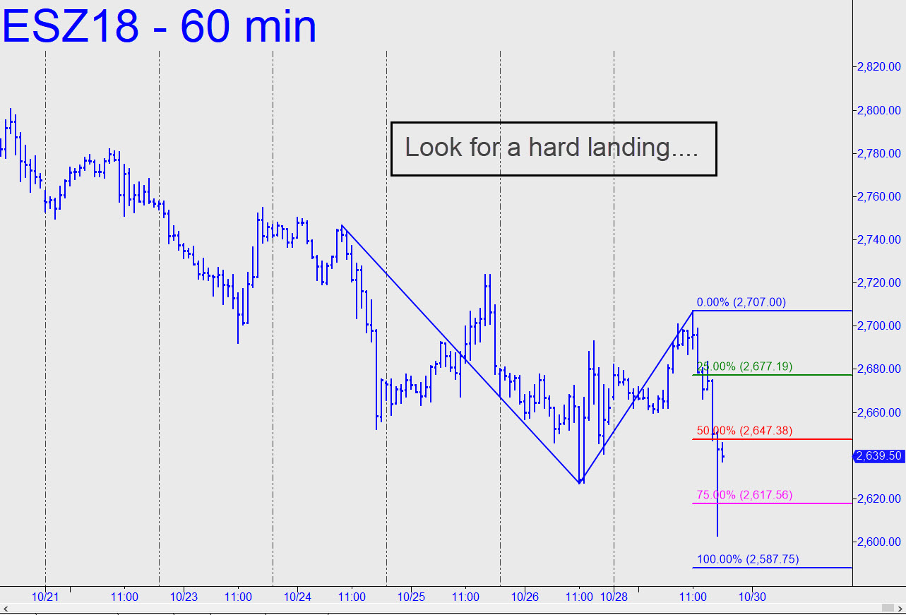 The 2706.50 target I put out Sunday night came within two ticks of nailing Monday’s high, which gave way to a 104-point avalanche. In the chat room, I suggested covering half the position for a small profit before the move started to snowball, but at least a few subscribers took my further suggestion that they hold a contract or two for a swing at the fences. This tactic didn’t pay off until late in the day, when it finally dawned on bulls that the broad averages were not coming back. The 2610.00 downside target I subsequently proffered near the end of the day gave way easily, suggesting the even though the futures subsequently bounced a whopping 43 points from an intraday low of 2603.00, they are likely to fall anew to the 2587.75 target shown before sellers are spent. I would reconsider this prediction if the December contract pushes above 2683.50 overnight or Tuesday morning. ______ UPDATE (Oct 31, 10:47): See my chat room posts for new rally targets that were disseminated in timely fashion earlier this morning.