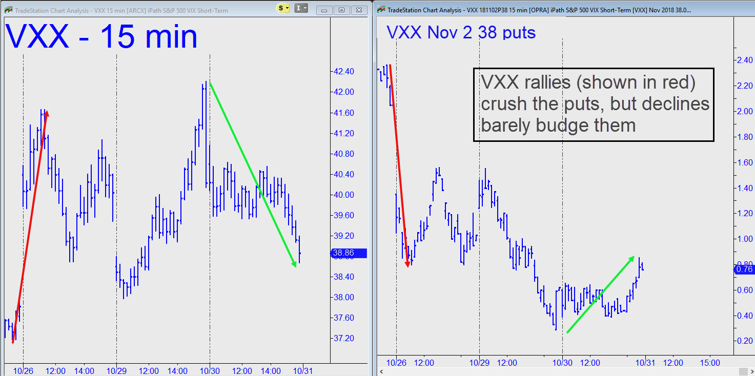 I’ve been offering more high-leverage option trades lately, but the most difficult place to find them, paradoxically, is in ETFs like this one that track market volatility. On Tuesday, for instance, although a stock-market rally shaved nearly 8% from the value of VXX, anyone who had correctly anticipated the move buying put options would have been disappointed with the results. Out-of-the-money puts at the 38 strike went from 0.29 to 0.85, but even a nimble trader with a crystal ball would have found it difficult to get aboard for less than 0.56, or to exit for more than 0.75. This was hardly the quadrupler we look for when we trade options on this vehicle. We’ve done quite well on these trades in the past, but mainly by catching big multi-day moves rather than precipitous declines that play out over just a day or two. Bottom line: This is a terrible vehicle for scalping in and out of options. Better to wait for reversals from major Hidden Pivot targets that can deliver big price swings.