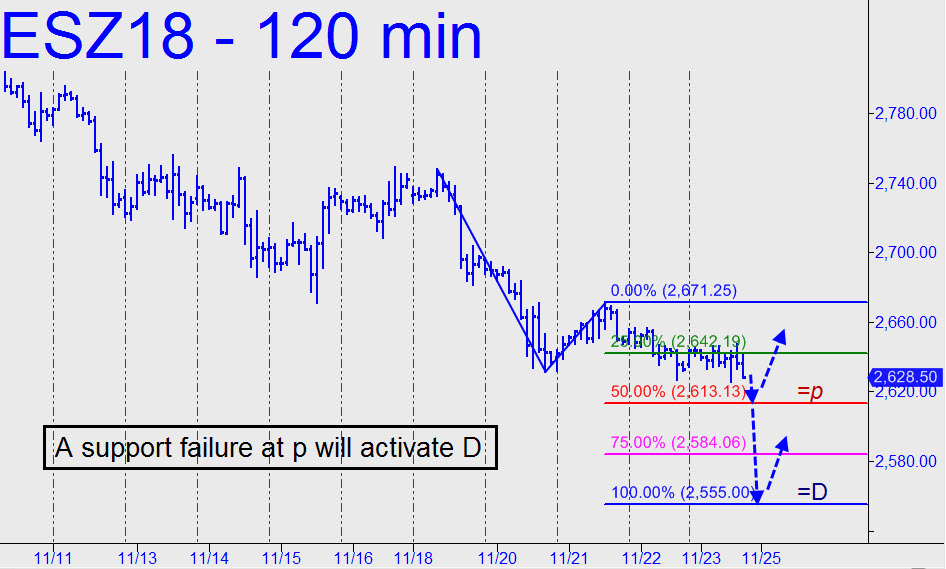 A 2624.75 target has kept us confidently on the right side of the trend as the futures have continued to fall. But now what? They got within 1.25 points of our price objective on Friday when shares fell moderately to end a holiday-shortened week. I have typically suggested bottom-fishing in such circumstances, any you can certainly do so here with a stop loss as tight as 2623.75 if Sunday night’s opening is sluggish. However, let’s also allow for a continuation of the bloodbath, using the 2613.13 midpoint Hidden Pivot shown in the chart as a minimum downside objective. As always, a decisive penetration on first contact would imply more slippage to the associative ‘D’ target — in this case 2555.00._______ UPDATE (Nov 26, 8:26 a.m. ET): The futures have taken a big bounce from within a millimeter of the 2624.75 target. The rally is moderately impulsive on the hourly chart but would become more so on a print exceeding 2671.25. If you got long at the bottom please let me know in the chat room so that I can determine whether to establish a tracking position.