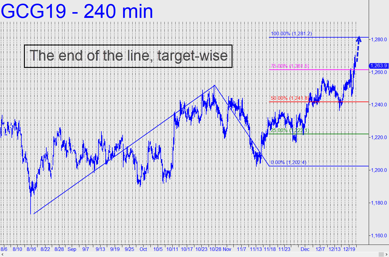 The tortuous rally begun in August is nearing the end of the line, a modest leap from a 1281.20 target that is the highest I am able to project using the intraday charts. This doesn’t mean the futures can’t go higher, even if the target provides resistance enough for scalpers to go short against it (tightly stopped, of course). What we should want to see is a move past 1281.20, since that would imply the trend is likely to continue. I hesitate to say the breach of the resistance need be easy or decisive, since that is not the way gold has been rolling lately. Any breach to the upside would be welcome, but we can only give it time, and be prepared if things don’t go quite the way we might wish. _______ UPDATE (Dec 26, 6:32 p.m.): After peaking at 1282.30, an inch above our target, the February contract has relapsed by more than $15. We’ll be able to judge bulls’ mettle by how quickly they can recover and push above 1281.20 — or better yet, close above it. _______UPDATE (Dec 28, 4:15 p.m.): There’s nothing more bullish than an uptrend, as the saying goes, but gold’s trek higher has been labored and tedious. As long as the February contract continues to push past Hidden Pivot resistances, though, our trading bias should remain bullish. The next lies at 1292.60. _______ UPDATE (Jan 2, 9:43 p.m.): The futures fell $5 after coming within two ticks of the 1292.60 target. The subsequent recovery has been quick, however, portending another leg up. Use p=1292.70 as a minimum upside objective, but expect more progress to 1298.50 if the initial ‘hidden’ resistance is easily brushed aside. Here’s the chart._______ UPDATE (Jan 3, 10:31 p.m.): Gold has been exceeding targets almost daily — not demolishing them, but penetrating them with sufficient force to put the next in play. That would now be the 1302.50 target shown here. Above it, the biggest remaining challenge, technically speaking, would be to take out an important ‘external’ peak at 1330.40 recorded. on June 14.