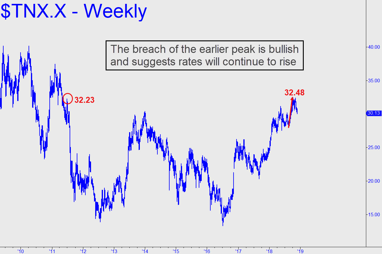 It has been a while since I last updated this vehicle, which tracks interest rates on the U.S. Ten-Year Note. Long-term yields have been in an uptrend for the last 29 months that looks likely to continue. The most compelling reason to expect this is a run-up in early October to 3.248% that exceeded an important ‘external’ peak at 3.223% recorded back in 2011. Although the breach was slight, it was sufficient to generate a fresh, bullish impulse leg on the weekly chart. This usually augurs a continuation of the trend. I had raised the possibility here earlier that the upward spiral in long-term rates would be self-limiting because it would eventually choke off the U.S. economy. That is still logical, but the chart is saying rates will continue higher regardless of the state of the economy. Another interpretation is that the economy will get second wind, and that a recovery in the housing and auto sectors will renew upward pressure on rates. We shall see. But the bottom line is that rates are likely head higher in 2019._______ UPDATE (Dec 5, 6:03 p.m. ET): Yields on the 10-year have come down hard this week. While this has done no significant technical damage to the daily chart, it bears watching. A key trendline support lies just below, at around 2.87%. Let’s see whether it holds. Regardless, it would take a print below 2.717% to generate a bearish impulse leg on the weekly chart.