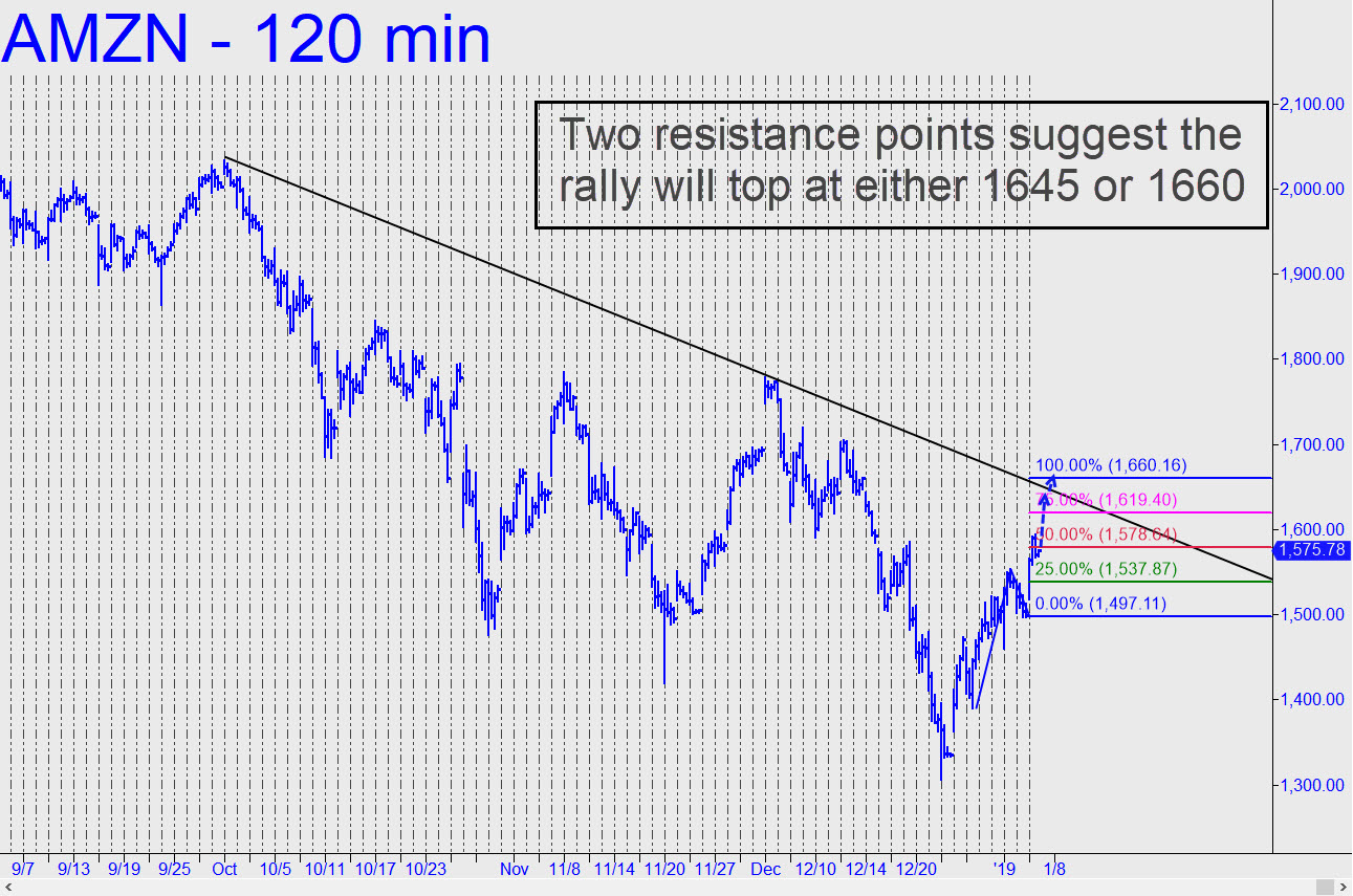 Friday’s $78 explosion topped at 1594.00, two-tenths of a percent from the 1590.38 rally target I’d posted in the Saloon before the opening. The rally looks like it has enough steam to push decisively past the midpoint resistance Sunday night and to continue to either of two targets shown. The first lies at approximately 1645, where the trendline I’ve drawn will come in; the second is a Hidden Pivot resistance at exactly 1660.16. If the stock should push past that last number, exceeding an ‘external’ peak at 1704.99 recorded on December 12, take it as a sign that this rally is destined to be more than your garden-variety short squeeze._______ UPDATE (Jan 8, 9:23 p.m. ET): Buyers demolished both of the resistance points identified above, clearing the way for a potentially nasty short squeeze in the days or perhaps weeks ahead. For starters, look for a test of some important ‘external’ peaks at, respectively, 1704.99 and 1718.93 that were recorded in December. If both are penetrated without much effort, AMZN would signal its readiness to take on December 3’s 1778.34 high and thereupon to become a 40% shot to achieve new all-time highs. Here’s a chart that shows it all.