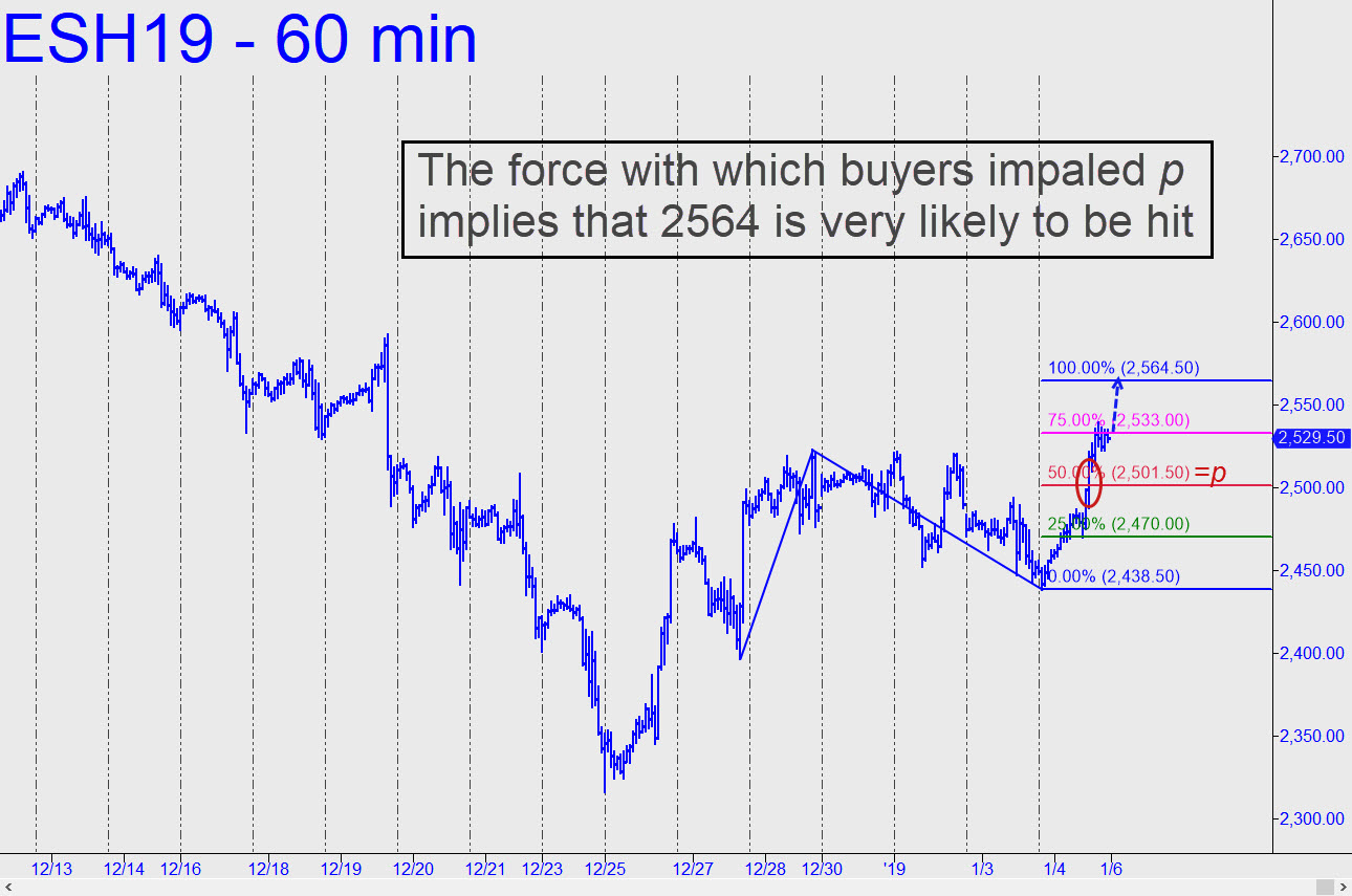 Friday’s short-covering binge blew past the 2501.50 midpoint resistance (see inset) with such force that there should be little doubt about a finishing stroke touching D=2564.50. I am recommending a tightly stopped short there only to traders who have made a few bucks being long for the ride up. It’s impossible to predict where the futures will open Sunday evening, but it may be possible to get long via a camouflage set-up on the 5-minute chart or lower. In any event, your trading bias should be bullish as the new week begins. _______ UPDATE (Jan 7, 6:57 p.m. ET): The 2564.50 rally target I flagged here (see above) and in the Saloon on Friday morning caught Monday’s high almost exactly. (Click here to see how exactly.) I’d recommended getting short at the target only to subscribers who’d made money on the way up, but there was only one person who appears to have done so, and that’s why I haven’t established a tracking position. The bullish phase of the trade was worth as much as $2300 per contract to anyone who got long when I first aired the target in the Saloon at 11:03 a.m. A short initiated subsequently at 2564.50 could have been covered for a profit of as much as $800 per contract, since the futures pulled back to 2547.25 after topping. If you need further guidance, ask in the chat room. _______UPDATE (Jan 8, 9:16 p.m.): Use the 2616.00 Hidden Pivot resistance shown here as a minimum upside target for the near term. As always, an easy move through so clear and compelling a ‘D’ would imply the trend is likely to continue. _______ UPDATE (Jan 9, 5:24 p.m.) A tedious day, so we lowered our sights to 2604.25, the target of a somewhat smaller pattern. Even with AAPL getting squeezed higher, however, the E-Mini S&Ps were unable to achieve it. This is mildly bearish; however, the picture could change overnight, since, whenever it is required of them, traders have amazingly short memories._______ UPDATE (Jan 10, 10:03 p.m.): Here’s a new chart with a slightly lowered target at 2602.75.