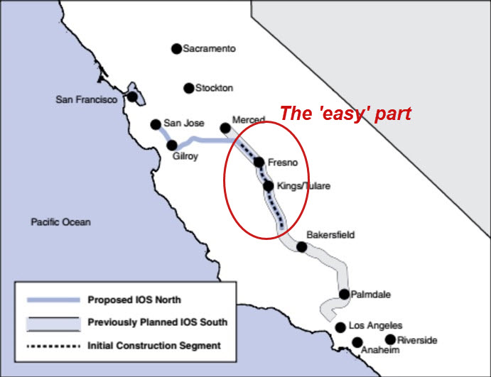 “The Perini-Zachary-Parsons bid was the lowest received from the five consortia participating in the bidding process, but “low” is a relative term. The firms bid $985,142,530 to build the wildly anticipated first section of high speed rail track that will tie the megopolis of Madera to the global finance center of Fresno. Do the division, and you find that the low bid came in at a mere $35 million per mile.