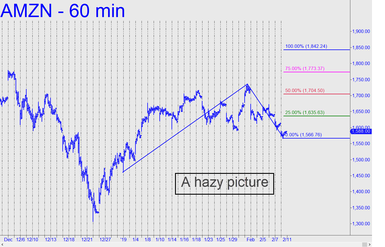 AMZN has stopped out a ‘mechanical’ long as we’d expected after failing to find traction last week for three consecutive days. The new chart shows a fanciful target at 1842.24, but it will shift lower if the stock falls even moderately on Monday. Otherwise, a print at 1635.63 would put the target theoretically in play while tilting our short-term bias ever-so-slightly bullish. DaBoyz appear to be biding their time, waiting for the next short-squeeze opportunity. The stock is expensive to heft, and that’s why we’ll see it move higher only when sellers are confident they’ll do best by simply stepping out of the path of panic-stricken bears. At the moment, there’s no hint that such an animal even exists._______ UPDATE (Feb 12, 7:48 p.m. ET): Today’s rally put the 1842.24 target in play. More immediately, we’ll use p=1704.50 as a minimum upside objective for the near term.________ UPDATE (Feb 21, 6:21 p.m.): Zzzzzzz. AMZN feels leaden, but nothing has changed. It would take a drop below 1566.76 to invalidate the 1704.50 target. ______ UPDATE (Mar 4, 11:47 a.m.): DaBoyz trapped bulls with a gap-up opening that peaked a visual millimeter above p=1704.50. That could be it for a while, but if the stock surprises with a second-wind burst, closing above p, it would signal an impending run-up to at least p2=1773.37.