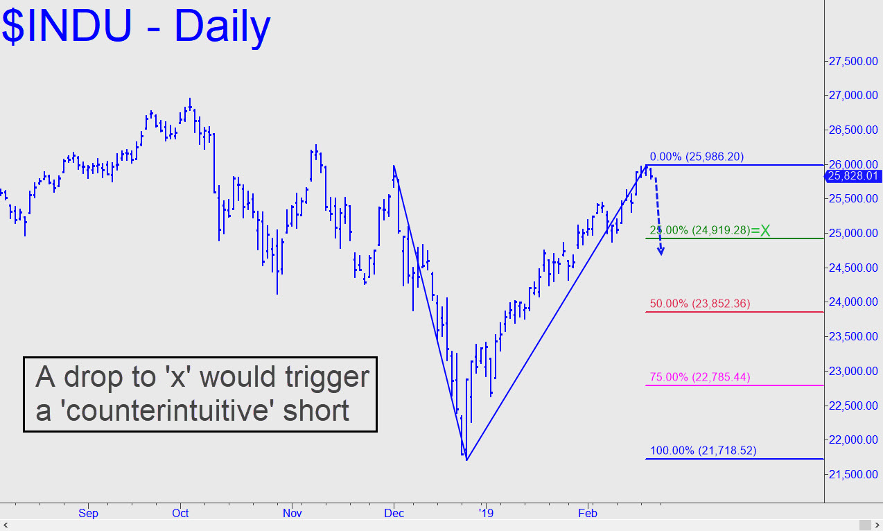 It’s surprising that stocks were able to make any headway at all in the wake of the Fed’s latest murmurings. Dovish they were not, but index futures still upticked for modest gains after the close on Wednesday. They peaked in volumeless trading overnight, however, and DaBoyz began Thursday unable to corral enough bears to keep the faux rally alive. If stocks open higher on Friday, or if they continue upward during the day, it’ll be tempting to fade buyers by acquiring some cheap put options. [This just in: Existing homes sales fell 1.2% in January, the lowest level in three years.]