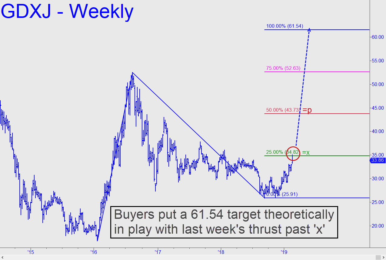 Last week’s encouraging 6% gain triggered a theoretical ‘buy’ signal at x=34.82 for a shot at 61.54. It could take a year or more to reach that Hidden Pivot, and although it is not pie-in-the sky because of the impressive look of the pattern, we’ll focus for now on a more realistic target at 43.73 for now. That is the pattern’ midpoint pivot, and it can serve as a minimum upside objective for now. Stay tuned for guidance on option spreads that could offer a cheap way to leverage the move. _______ UPDATE (Mar 4, 6:45 p.m.): Two weeks of selling have generated a so-far weak impulse leg on the daily chart without altering its bullish look or that of the longer-term chart shown in the inset. _______ UPDATE (Mar 6, 10:15 p.m.): The ‘bullish look’ alluded to above will endure until such time as mid-January’s low at 29.25 is exceeded. Looks aside, the plunge from Feb 20’s high at 35 is more than a little discouraging. GDXJ looks like it will test the 29.25 low before it can turn around. _______ UPDATE (Mar 21, 9:36 p.m.): The 34.07 rally target shown in this chart is tied to a tired-looking impulse leg, but GDXJ should get there anyway because of the larger, bullish ABC pattern that is also pushing this rally. Will it take a week? We shouldn’t be surprised if this proves to be the case, since that’s the way gold rolls.______ UPDATE (Mar 28, 9:34 p.m.): Once again, gold has snatched defeat from the jaws of victory, causing this junior-miners ETF to fall 3.5% in the space of a few hours. It became a ‘mechanical’ buy at 32.05, stop 30.60, but the signal is weak and the trade is therefore not recommended. _______ UPDATE (Apr 1, 10:32 p.m.): The 29.84 downside target shown here looks like a lay-up. You can use it to bottom-fish with a 29.87 bid, stop 28.79. (4/2 addendum: If GDXJ is going to reverse, it will need to come from p2=30.78, where the downtrend has stalled for the last two days.) _______ UPDATE (Apr 4. 6:05 p.m.): Very cute, today’s goosing. Now, if buyers can push this brick above a minor ‘external’ peak recorded a week ago at 32.14, it would create a minor bullish impulse leg.
