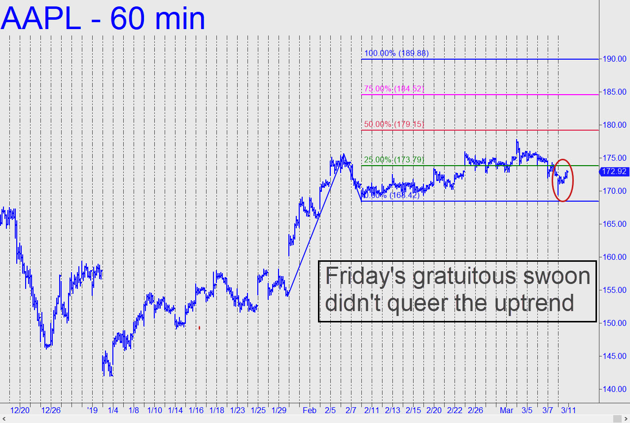 Friday’s gratuitous swoon did not significantly change the perception that AAPL is headed for the 189.88 target shown in the chart (click on inset). In fact, if the pullback had come from our sweet spot between p and p2 (respectively, the red and pink lines), I’d have suggested a mechanical bid at 173.79 on Thursday. As things stand, although the initial pullback may have discouraged some bulls, my hunch is that it simply shook them out. If so, the stock’s next upthrust will not have their profit-taking urge impeding its progress. A close above the green line would undo whatever misgivings we might have about boarding the bullish bandwagon. For now, though, we’ll simply wait and watch. _______ UPDATE (Mar 11, 9.40 p.m.): Today’s powerful, gap-up rally stalled three cents from the 179.15 midpoint resistance shown in the chart (click on inset), confirming the pattern and its 189.88 target. As always, a decisive move through p will make the target an odds-on bet to be reached. Here’s a new chart that shows it all.