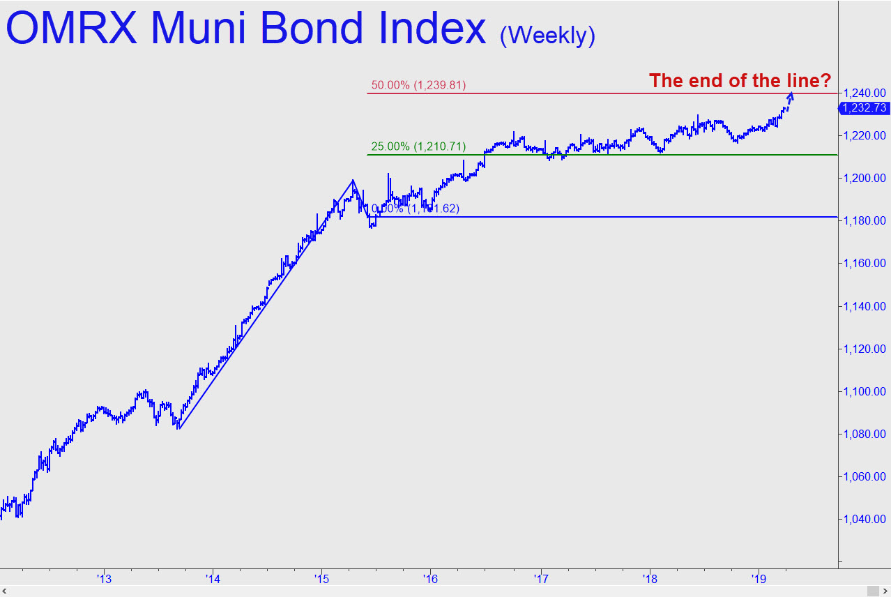 Like most of the money being borrowed by state and local governments these days, whatever Illinois raises will go mainly into distressed pension plans. Chicago Mayor Rahm Emanuel took another route in his last fiscal act as mayor, however, foregoing a $10 billion bond that had been earmarked for pensions. This task will fall to his successor, who could conceivably have the distinction of presiding over the bankruptcy of America’s third-largest city. If investors clamoring for Illinois debt just to eke out a few extra basis points know better, they certainly are not acting like it. Their heedless behavior is not confined to Illinois either; it is happening all over the country, pushing muni bond funds higher (click on inset to see bull market target) and yields to their lowest levels since last August. Although it’s a shot in the arm for financially strapped cities, investors’ inattentiveness to risk suggests the muni-bond binge will not end well.