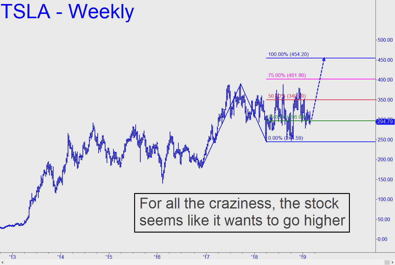 Through it all, the stock has fluctuated over the past ten months with violent swings from around $250 to $390. The long-term chart (see inset) suggests this is a consolidation for a move to higher levels. It implies that a 63% rally to $454 from a current $294 is possible (as is bankruptcy, of course). Whatever happens, the ability of TSLA to stay aloft with the regulators coming at the company so hard, and with Tesla itself making radical changes on-the-fly in the way it operates, has been a remarkable and highly entertaining spectacle. While the SEC may not be susceptible to a knockout punch, Musk, with a wicked jab and a cross that comes out of nowhere, could be the most formidable and determined foe the regulators have faced. _______ UPDATE (Mar 4, 10:51 .m.): Bulls are struggling this morning to hold support at 288.13, the midpoint Hidden Pivot of a clear and compelling ABCD pattern. If it fails, the stock will likely fall to at least D=252.02._______ UPDATE (Mar 4, 6:14 p.m.): Sellers breached the support noted above, making a further fall to as low as 252.02 more likely. More immediately we can use the 270.07 secondary pivot (p2) shown in this chart as a minimum downside objective for the near term._______ UPDATE (Mar 5, 5:12 p.m.): TSLA trampolined $14 from within three cents of the 270.07 target I’d provided above. A subscriber reported getting long at the bottom and eventually exiting $12 higher, but because I require at least two such reports to establish a tracking position, I did not update my guidance. If and when the stock breaches 270.07 decisively, it should be presumed bound for exactly 252.02, the target noted above.
