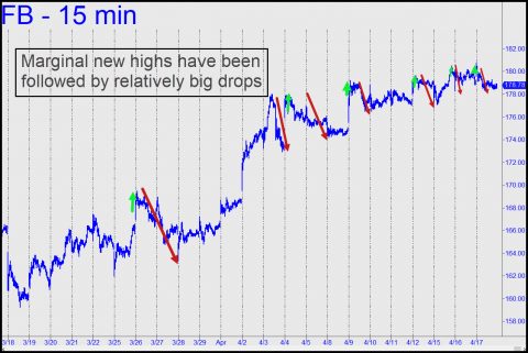 As the chart shows, the stock has made a series of marginal new highs, each followed by a relatively stiff pullback. If you’d been long the stock at April 3’s 177.96 peak, you’d have needed to weather a $5 swing against you just to net a four-cent gain at the next peak. The 179.19 peak that followed that one, making you $119 richer on 100 shares, required sitting tight on a dive that at its low would have made you $373 poorer.