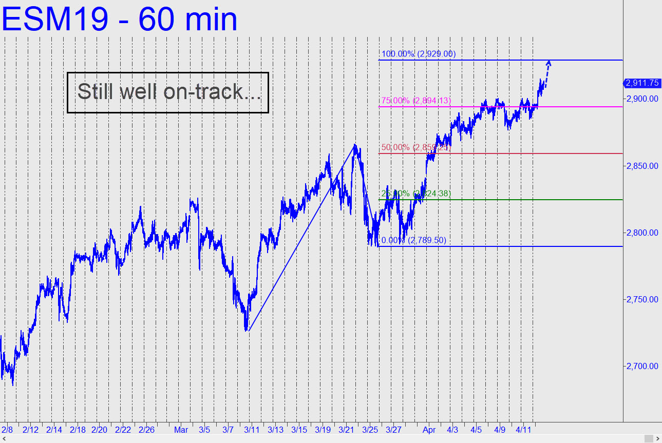 A longstanding rally target at 2929.00 has served us well, keeping us confidently on the right side of the trend. It now looks extremely likely to be reached, but the question is whether it will be decisively exceeded. I expect the Hidden Pivot to show stopping power, probably tradeably so, but I would recommend going short there only if you have made at least 3-4 points of profit on the way up. You’ll need all of it to provide an ample stop-loss on entry. I say this because the C-D rally leg begun on March 25 provided no opportunities to get long ‘mechanically’. This attests to the power of the move, and it raises the odds of a thrust to even higher levels regardless of whether a correction is needed first to get a running start. Even a slight breach of 2929.00 would make a run-up to new record highs all but inevitable. That would not negate my skepticism that the powerful move begun on December 26 has been a bear rally. Too many agree with this judgment, however, to make a move to new highs an easy short.