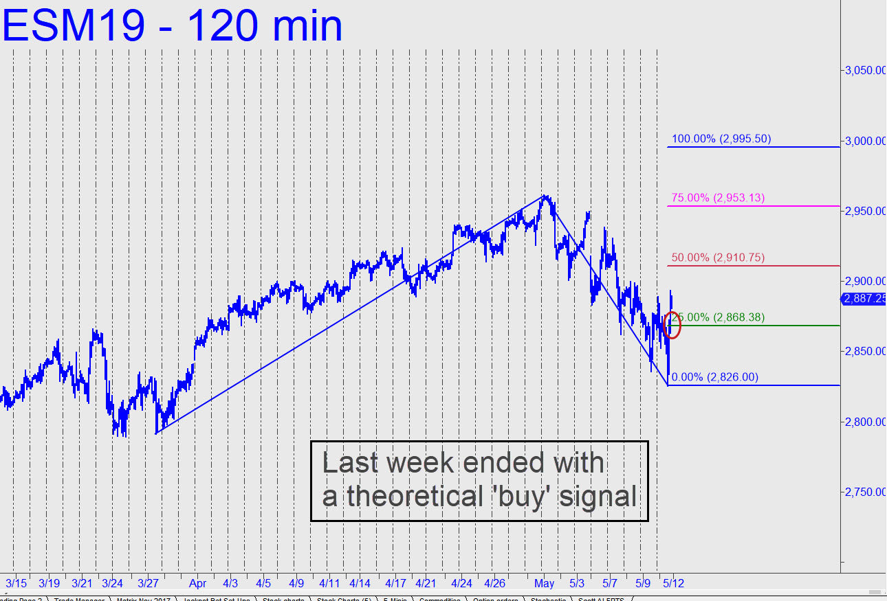If last week’s tortuous, ratcheting downtrend is the best that sellers can do with a collapse in trade talks to help them, then we should take Friday’s bullish finishing stroke as a valid ‘buy’ signal. I’d written here earlier that a failure to produce an agreement between the U.S. and China would not be bearish for stocks, but instead prove to be a case of sell the rumor, buy the news. If this is so, and barring the always-possible Sunday night surprise, we should see the futures push above p=2910.75 (click on inset) on Monday or Tuesday. A subsequent pullback to the green line from our sweet spot between p=2901 and p2=2953 would trip a ‘mechanical’ buy signal. _______ UPDATE (May 13, 6:35 a.m. ET): Overnight, the futures have given up two-thirds of the very substantial gain they achieved via Friday’s explosive short squeeze. If DaBoyz have to take the futures down by 40 points just to dry up sellers this morning, stocks are in worse shape than I’d thought. The rallies have become almost too scary to short, but also too fleeting to distribute. That’s dangerous. Our best bet — effectively against sanity, and still reasonably priced — is VXX calls. _______ UPDATE (May 13, 11:23 a.m.): The buy triggered at 2821.81. The implied initial risk per contract, using a 2726.00 stop-loss, is $4750 per contract, or $19,000 for a four-contract position. Best to paper trade this one to see if it works. If so, it should add to your confidence in mechanical trades in general. _______ UPDATE (May 14, 10:48 a.m.): If you took a position with real money as some subscribers appear to have done, book profits on half near 2838 — $850 per contract at the moment — and use a break-even stop-loss for what remains. We’ll swing for the fences now, meaning 2910, or possibly even 2995.
