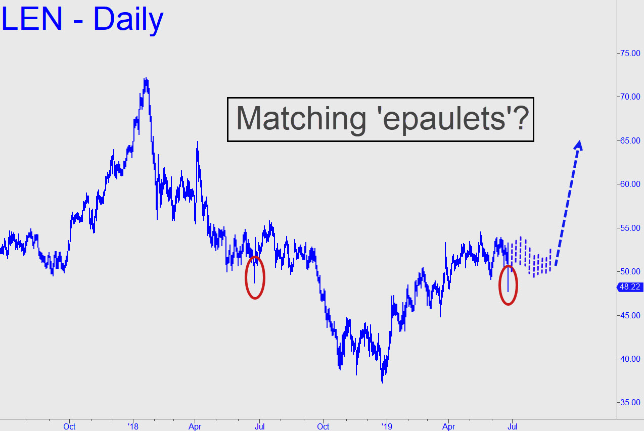 And yet, study Lennar’s chart (inset) and you can easily imagine a reverse head-and-shoulders pattern taking shape with the power to launch Lennar, and presumably other ‘homies’, significantly higher within the next four to six weeks. I have never put much store in H&S patterns because they are virtually everywhere a trader wants to see them. But this one, with drooping epaulets that look like perfectly matched earrings, is so alluring as to confound the skeptic. We’ll probably know by mid-July whether the chart was warning of trouble or throbbing with opportunity. In the meantime, if we get another month of declining home sales, don’t scoff at the possibility of a trampoline bounce-from-nowhere in this statistic. _______ UPDATE (Jul 1, 7:27 p.m.): If bulls are going to turn the stock around, their best opportunity will come at 46.22, a midpoint Hidden Pivot support shown in this chart.